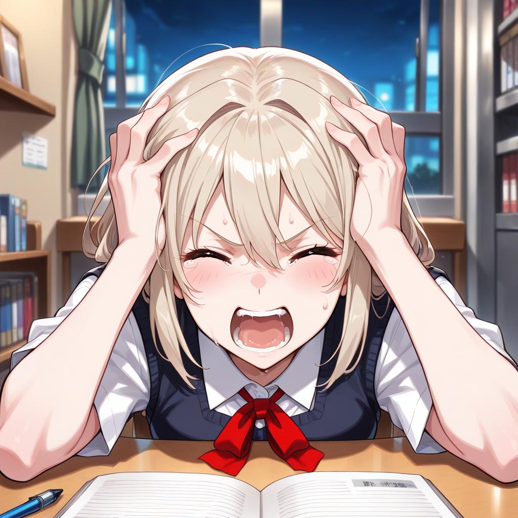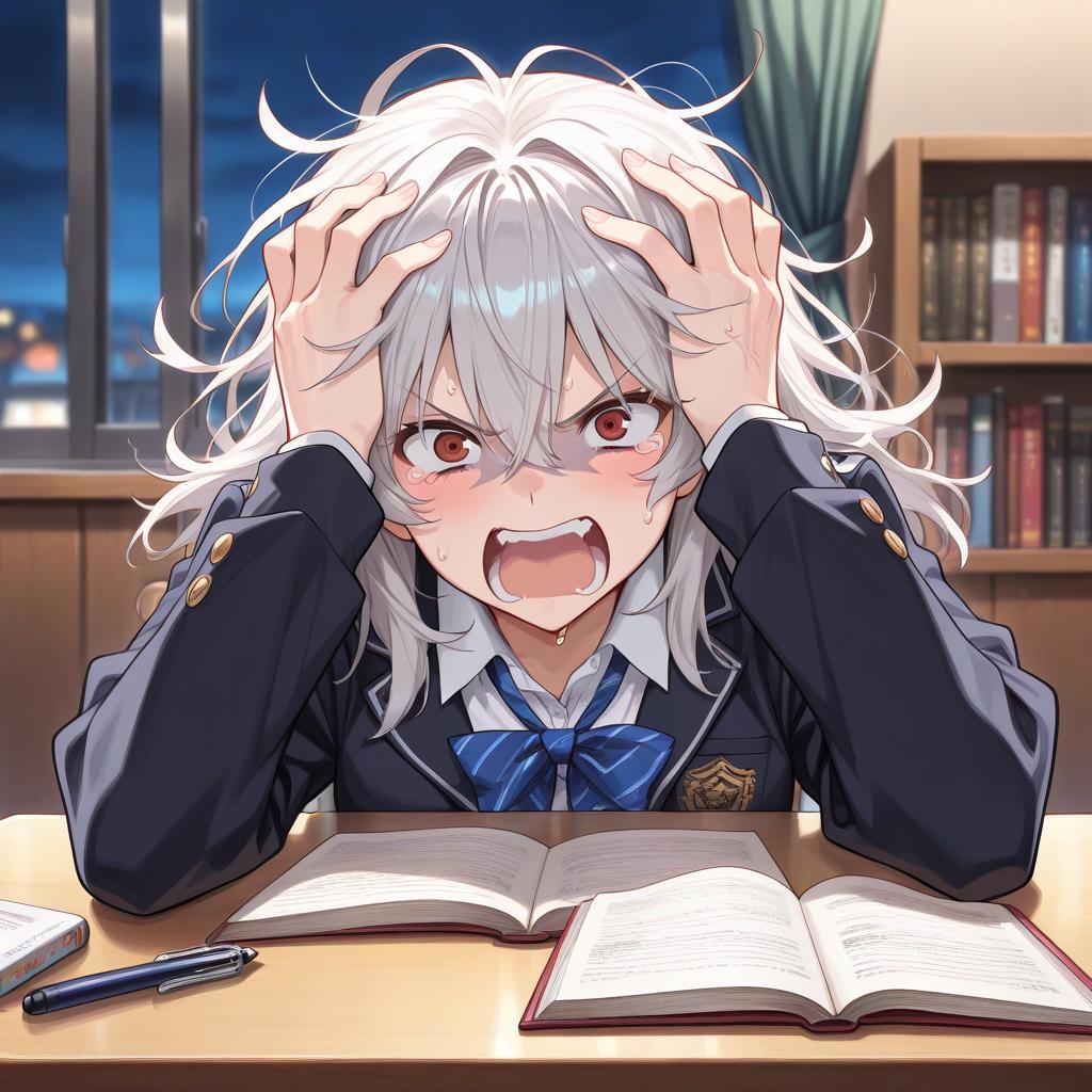 (masterpiece:1.3), (best quality:1.2), 8k, absurdres, unity 8k wallpapper, (extremely detailed:1.3), highestres, 1girl, looking at viewer, open_mouth, (screaming:1.2), indoors, blurry background, pain, angry, frown, closed eyes, solo, wrinkled skin, hands on own head, sharp teeth, fangs, school uniform, books, pen, table, tears, tongue, night, study