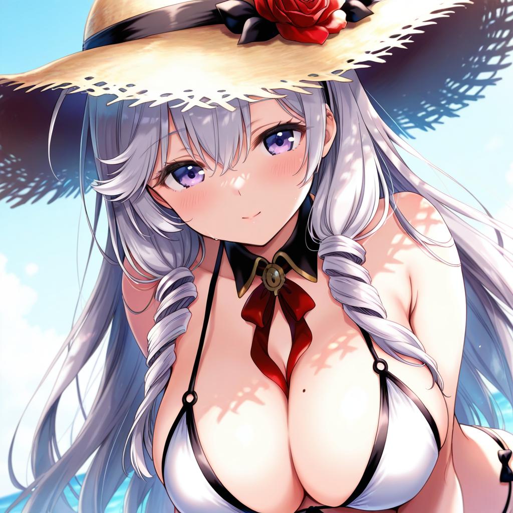 Algerie (azur lane), azur lane, 1girl, purple eyes, hair between eyes, mole under eye, grey hair, long hair, very long hair, white hair, large breasts, mole on breast, cleavage, white bikini, two-tone bikini, straw hat, hat flower, bare shoulders, twin drills, drill sidelocks, by artist konayama kata, illustrious
