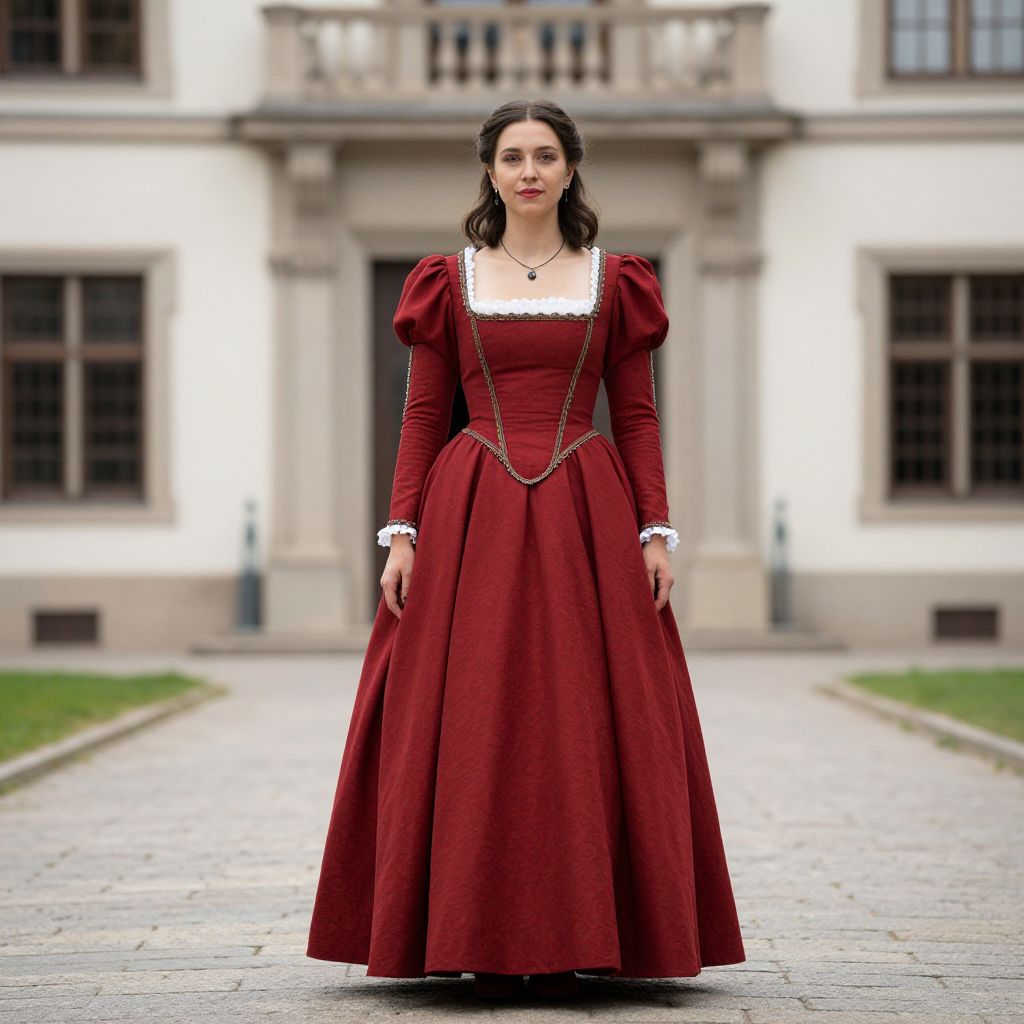 Photograph of a young woman with pale skin and dark brown hair standing in front of a grand, classical building with large windows. She is wearing a deep red, long-sleeved, Renaissance-style gown with puffed sleeves, a square neckline, and white lace trim on the sleeves and neckline. The gown has a fitted bodice and a full skirt, cinched at the waist with a gold chain. She has a small pendant necklace and a serious expression. The background shows a stone pathway with green grass on either side, leading up to the building's steps. The overall scene has a historical, fairytale-like atmosphere.
