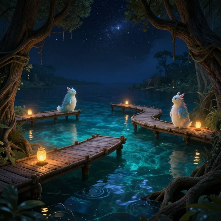 Dockmartin fantasy-inspired floating docks with ethereal glowing lanterns, mystical creatures gently hovering nearby, crystal-clear waters reflecting starry night sky, ancient tree roots intertwined with wooden beams, magical atmosphere blending nature and fantasy art styles.