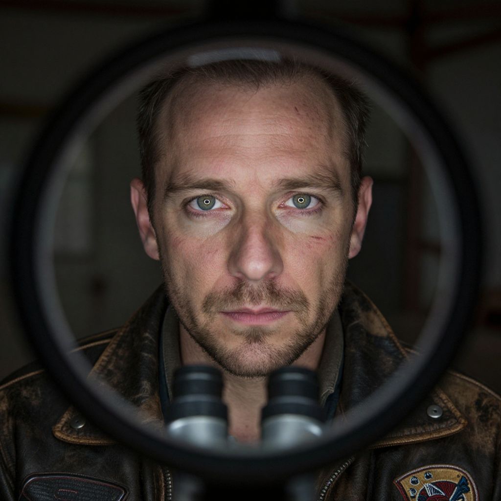 Photograph of a middle-aged Caucasian man with blue eyes, fair skin, and short brown hair. He has a light beard and a small scar on his right cheek. He wears a brown leather jacket with a colorful patch on the left side. The image is viewed through a circular lens, focusing on his face, which is centered in the frame. The background is dark and blurred, creating a dramatic, intense atmosphere. The man's expression is serious and focused, with his gaze directed straight at the camera. The lighting highlights his facial features, casting subtle shadows.