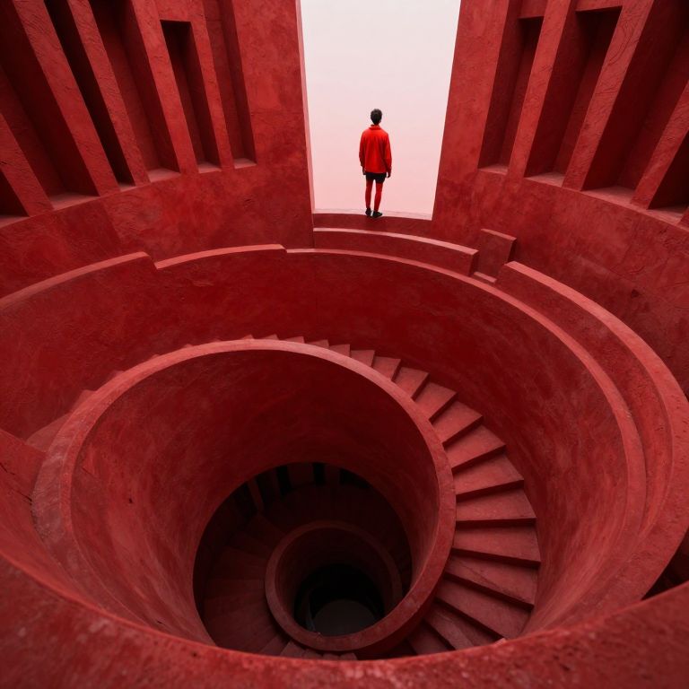 Amidst the labyrinthine embrace of spiraling architecture, a solitary figure in vibrant red ascends toward an elusive horizon, embodying the paradoxical journey of hope and futility, where every step echoes the weight of purpose yet whispers the inevitability of transience.