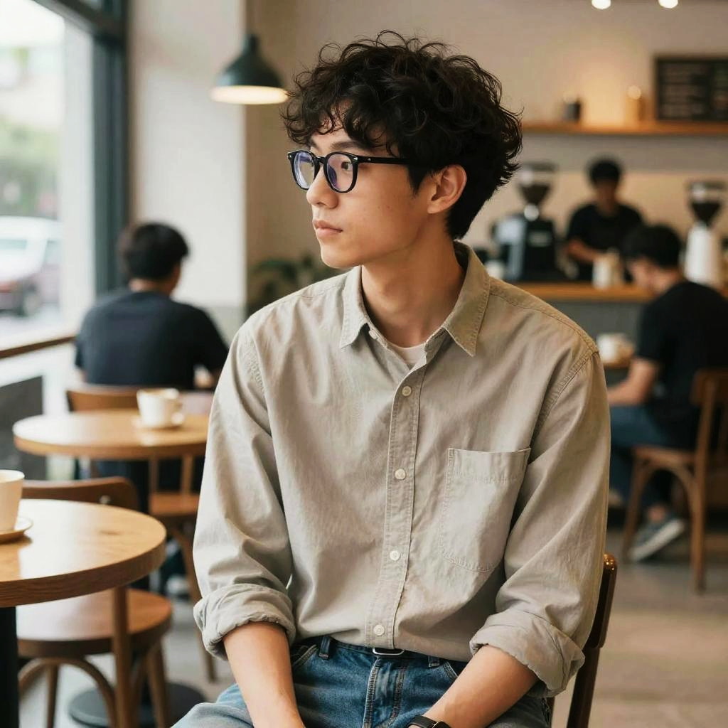 540 Waves hairstyle on man with glasses, wearing casual button-up shirt and jeans, in modern coffee shop, captured in fashion editorial style with diffused daylight.