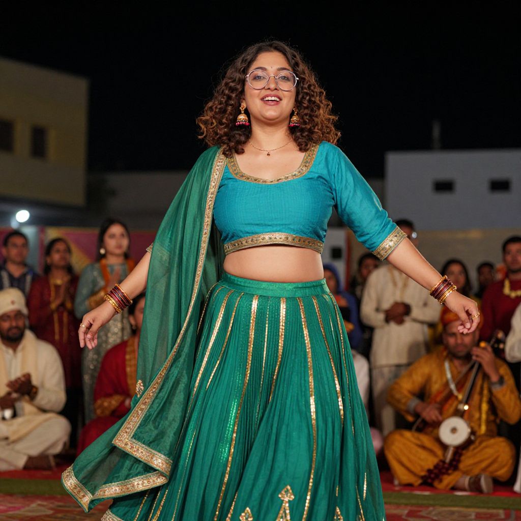 A joyful woman with round glasses, curly brown hair, and a warm, expressive face dressed in a bold kameez ghagra costume — the kameez is turquoise with gold borders and the ghagra is a shimmering emerald green with gold thread work — dancing under a starlit sky at a cultural festival in Gujarat with traditional music and audience in festive attire.. The woman has big tits and cute face