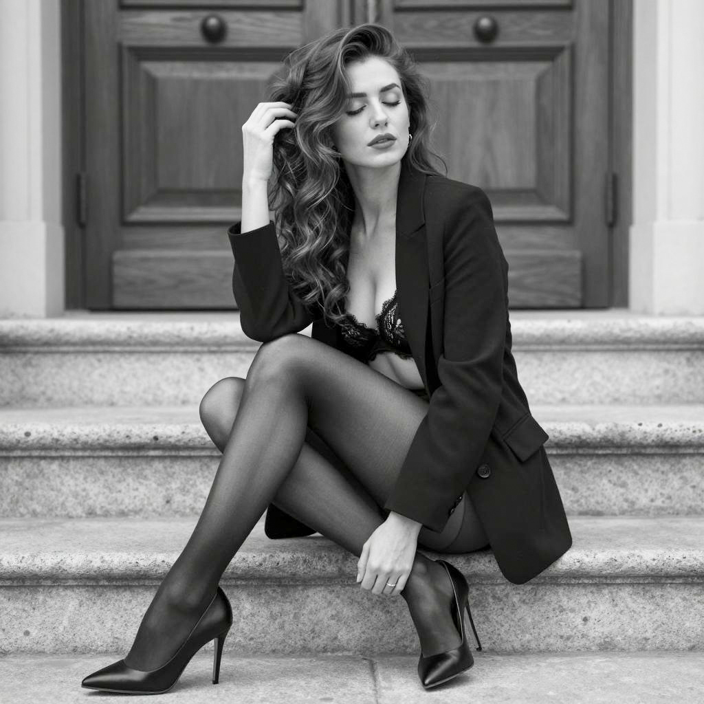 Woman in black lace corset and lace panties, standing in a stone alleyway, leaning against a wall. She has long dark hair, high heels, and one leg raised. Her eyes are closed, and she has an intense expression. Background includes stone walls and a barred window. Black and white photograph.