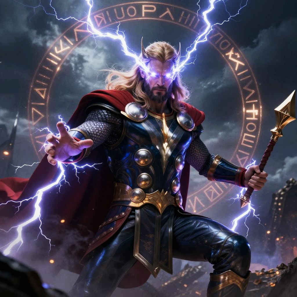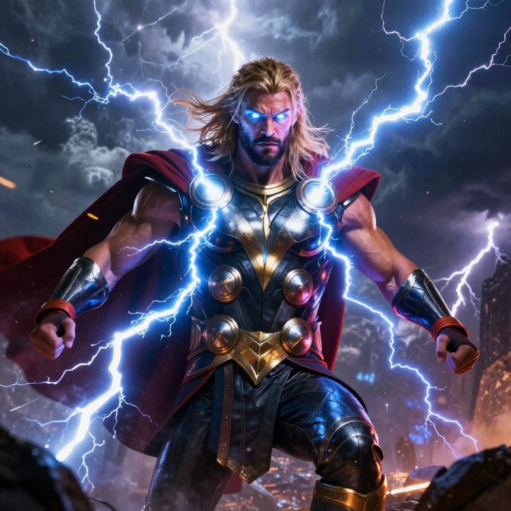 Powerful Thor lightning eyes glowing fiercely, electricity arcing from his eyes, godlike aura surrounding him, storm clouds and lightning strikes in background, dynamic action scene, fantasy art with strong contrast and vivid lighting, heroic and intense atmosphere