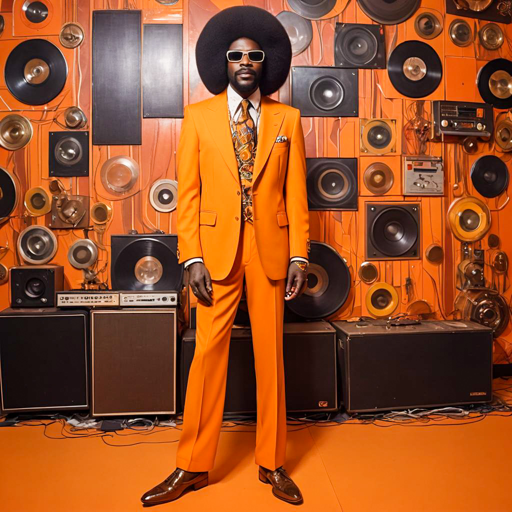Funk artist wearing a bold orange wide lapel suit with a patterned tie and platform shoes stands confidently on a colorful 1970s style concert stage. The performer sports an afro hairstyle and sunglasses, surrounded by an audience and band members dressed in similar retro attire emphasizing orange and brown tones.