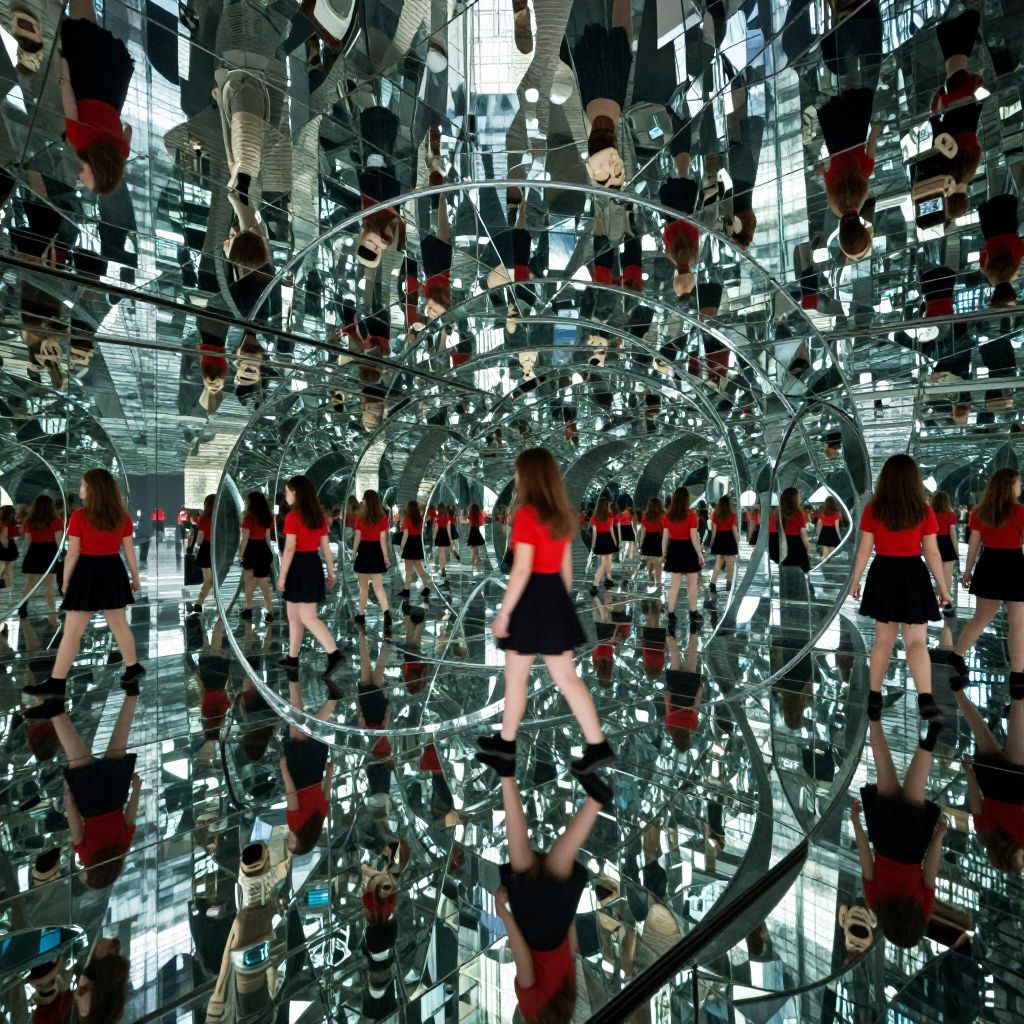 A woman in a red top and black skirt walks through a mesmerizing, spiraling tunnel crafted from interlocking mirrors, creating an endless array of reflections and infinite, shifting versions of herself under dramatic lighting, evoking a surreal and immersive visual experience.