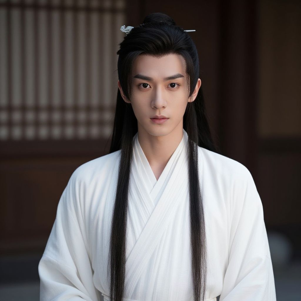 "adult chinese costume, 1boy, male focus, solo, black hair, chinese clothes, looking at viewer, long sleeves, realistic, blurry background, blurry, hair ornament, wide sleeves, asian, own hands together Realistic photo of casual sexy person with pretty face"