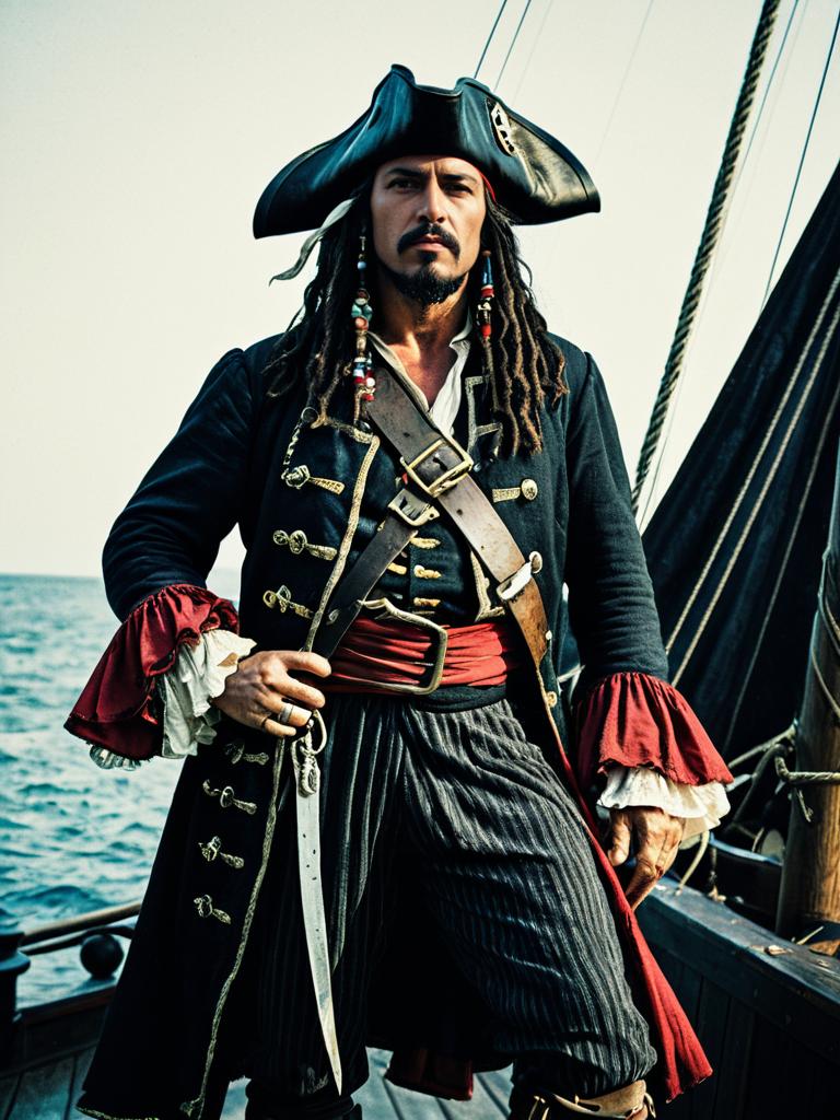 Man in Peg-Leg Pirate Costume, photorealistic cosplay portrait, cinematic realism