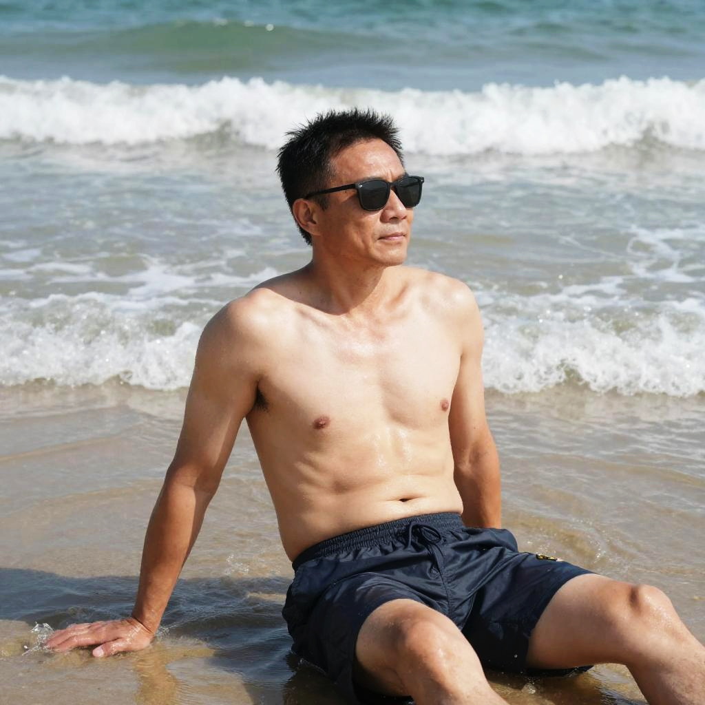 Sexy 40 year old men, athletic and casual, beach setting with soft waves, sun-kissed skin, relaxed posture, sunglasses, natural environment, vibrant color palette