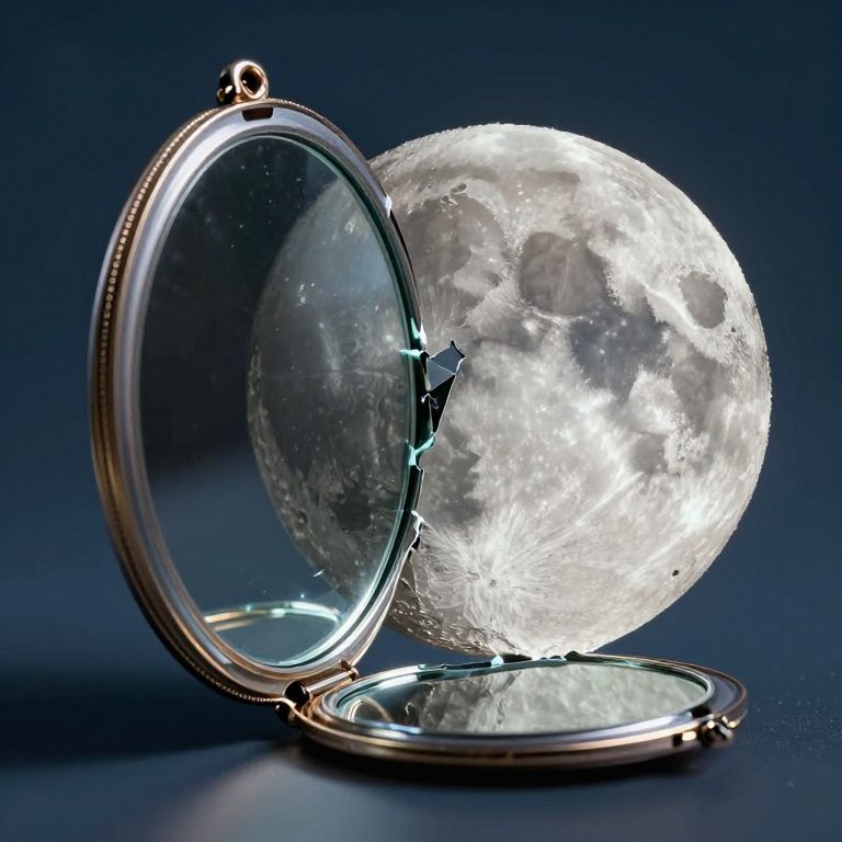 A highly detailed photograph of a silver, round, open mirror resting against a large, clear glass moon with visible craters. The mirror's reflective surface shows a partial reflection of the moon's textured surface. The background is a deep navy blue, creating a stark contrast with the bright, shiny moon and the reflective mirror. The moon's glass-like texture and the mirror's polished metal surface are highlighted by bright lighting, emphasizing their clarity and detail. The image has a surreal, magical quality.
