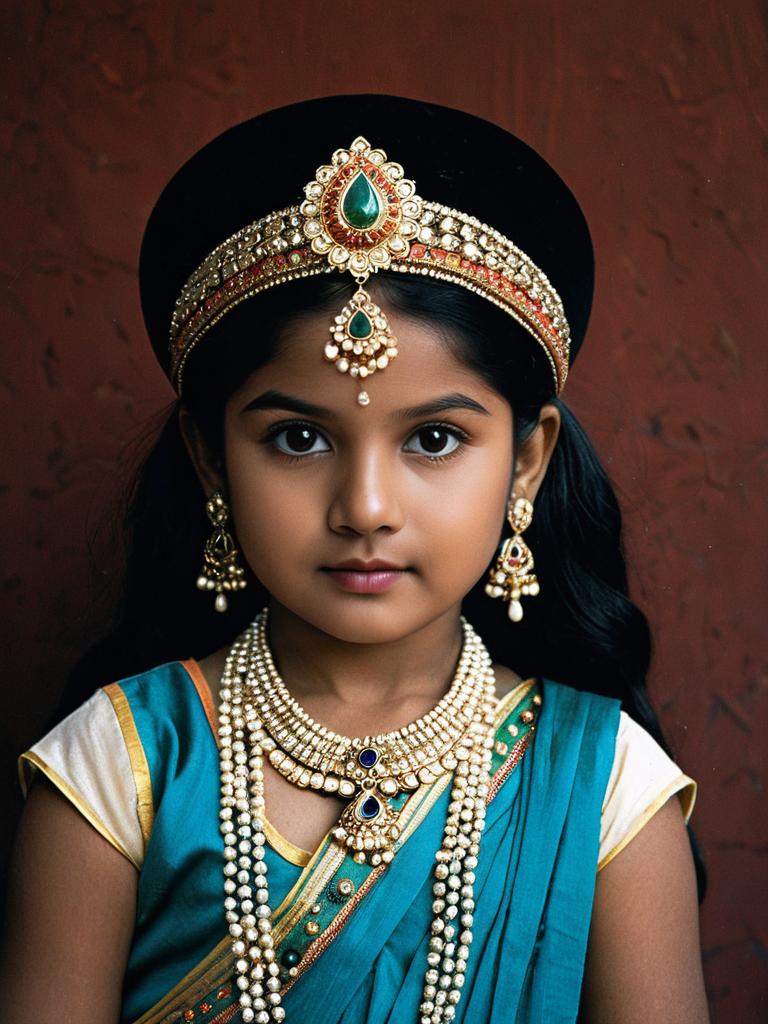Child radha krishna serial, solo, 1girl, jewelry, looking at viewer, earrings, hat, necklace, black hair, sash, upper body, child, closed mouth
