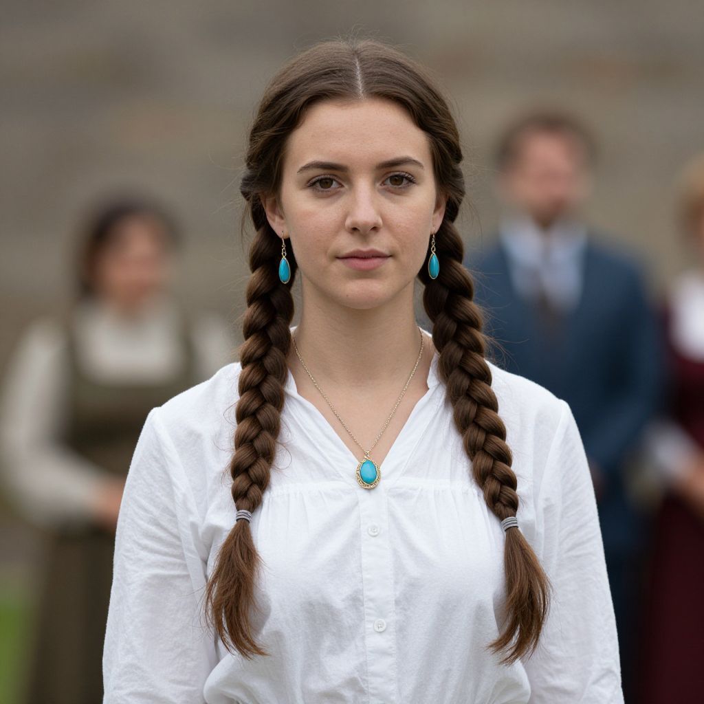 Irish woman clothing costume, 1girl, solo, jewelry, brown hair, braid, realistic, twin braids, blurry background, blurry, long hair, looking at viewer, shirt, earrings, necklace, white shirt