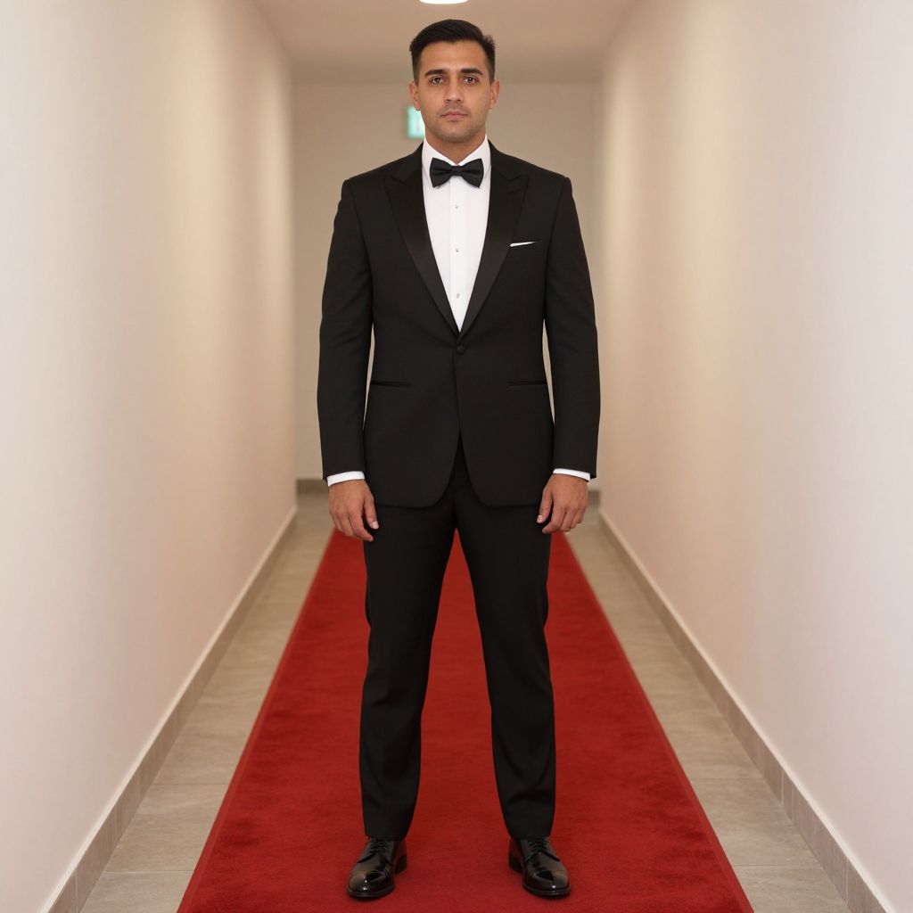 Photograph of a young man standing on a red carpet in a white-walled hallway. He has short, dark hair and medium brown skin, wearing a black tuxedo with a white dress shirt and black bow tie. His black dress shoes are polished, and he stands with a neutral expression, hands by his sides. The hallway is well-lit with a bright, even light, and the red carpet runs the length of the room. The overall style is formal and elegant.