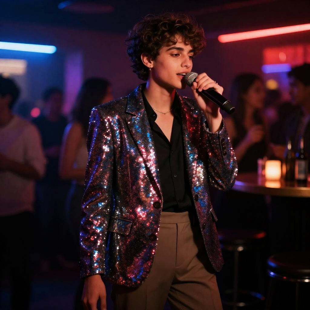 Non-binary person with glittering sequin blazer and tailored trousers enjoys a lively party in neon-lit underground jazz bar, surrounded by vibrant colors and soft shadows.