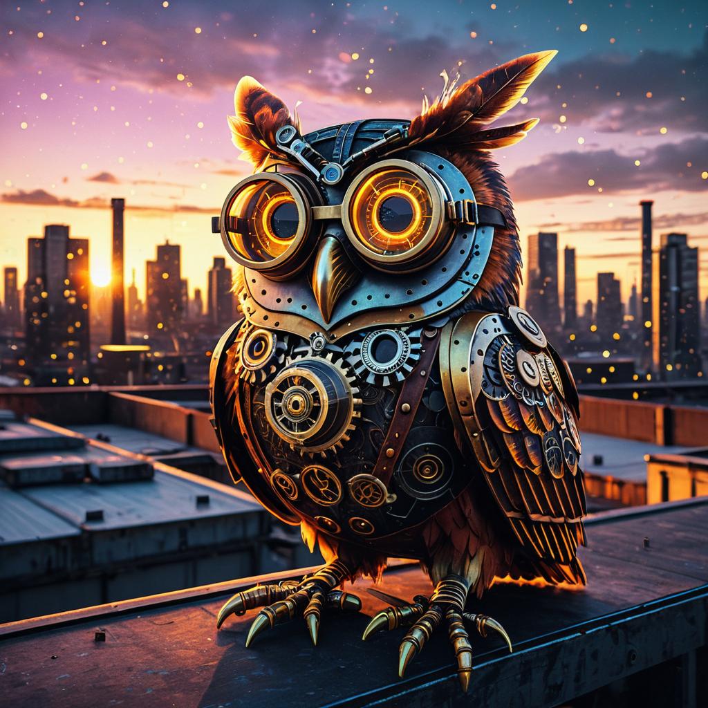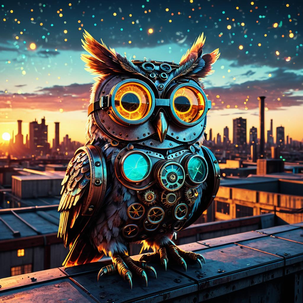 Curious steampunk owl wearing goggles in an industrial urban rooftop at sunset with a dusky skyline, rendered in detailed digital art with vibrant neon highlights with glowing fireflies and a gentle warm color palette.