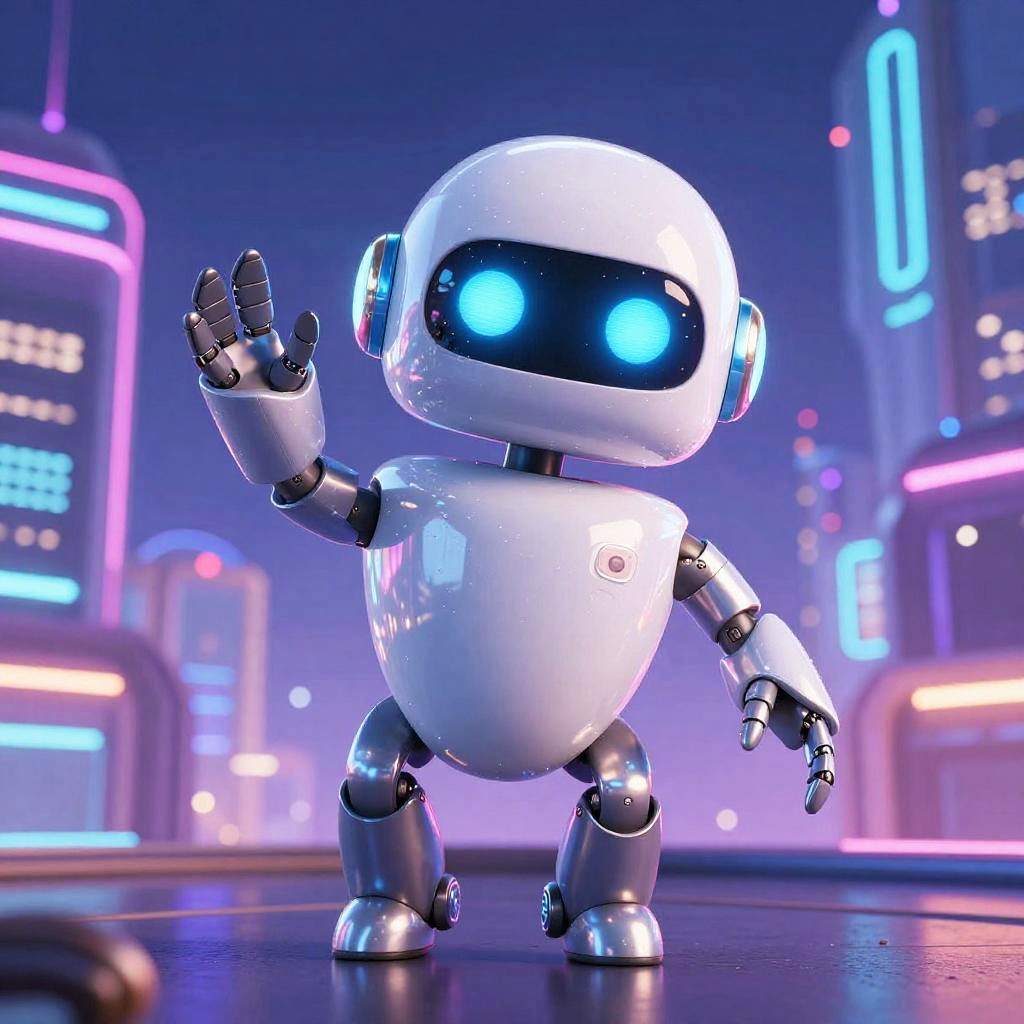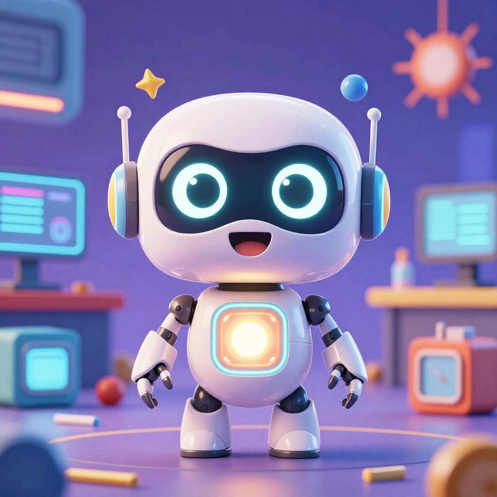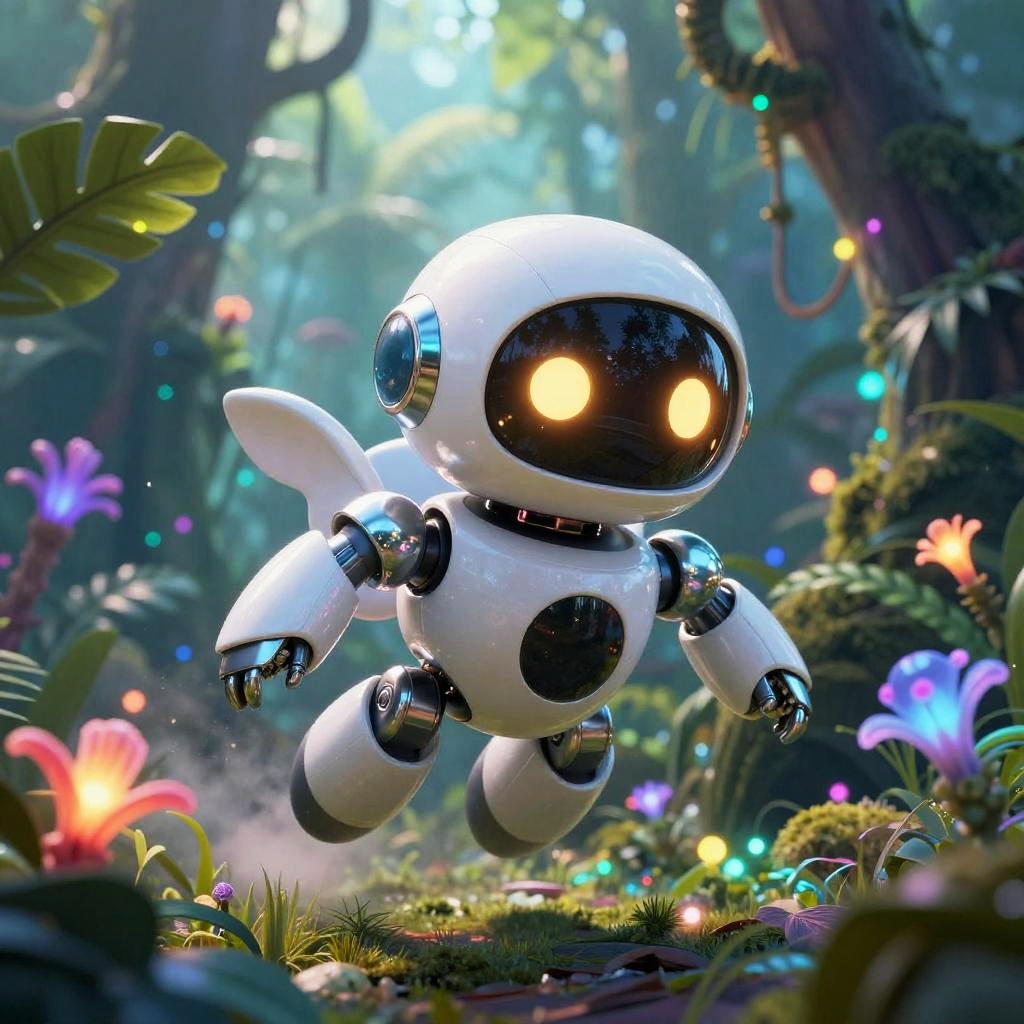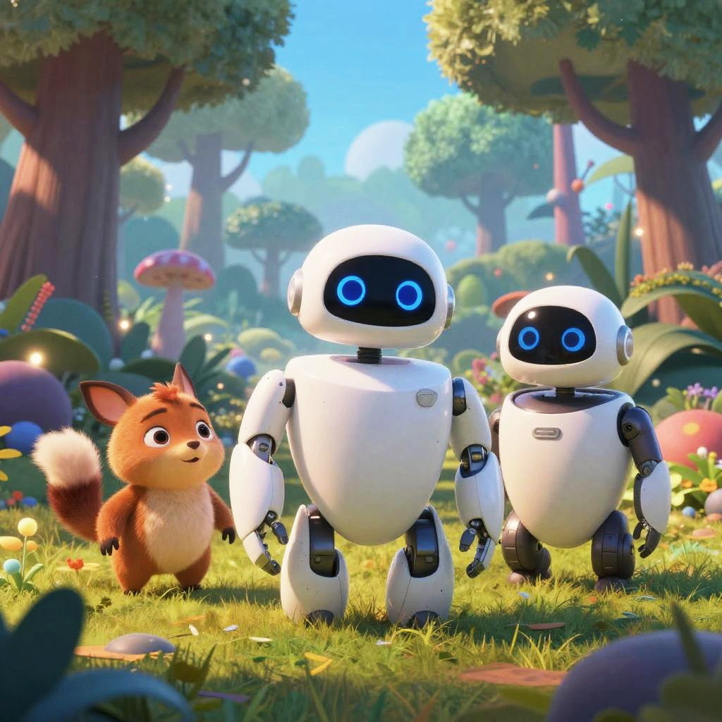 Cartoon character AI in a whimsical forest setting, featuring a cute android with glowing circuits and friendly smile, surrounded by animated animals and magical plants, vibrant color palette, animated movie concept art