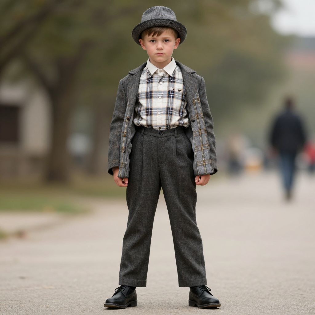 Retro vintage costume, 1boy, plaid shirt, solo, male focus, hat, jacket, shirt, pants, full body, black footwear, outdoors, realistic, standing, shoes, collared shirt, looking at viewer, open jacket, plaid, open clothes, blurry, blurry background, closed mouth