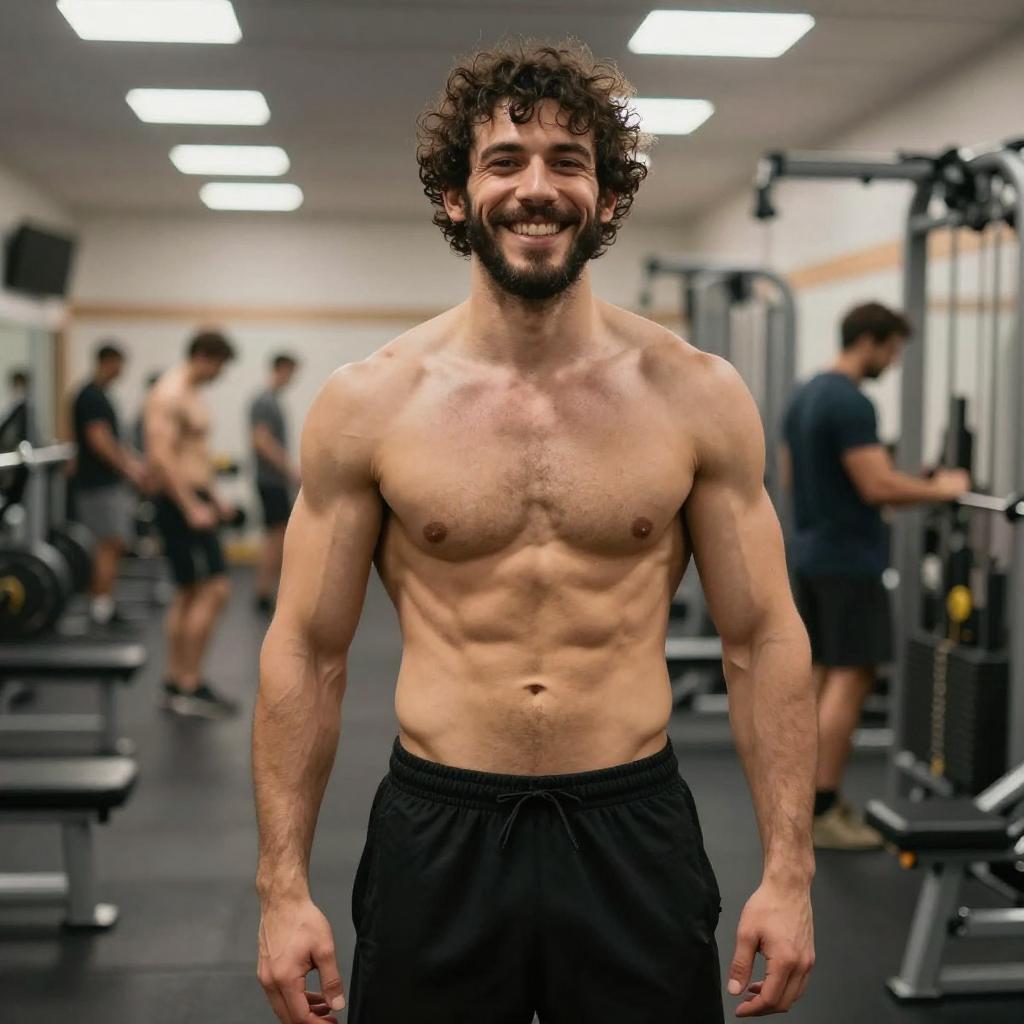 Photograph of a smiling, muscular man with curly dark hair and a beard, standing in a gym. He's shirtless, showing defined abs and chest muscles, wearing black workout shorts. The background is slightly blurred, featuring gym equipment and other people exercising. The room is brightly lit with overhead lights, creating a focused, energetic atmosphere.