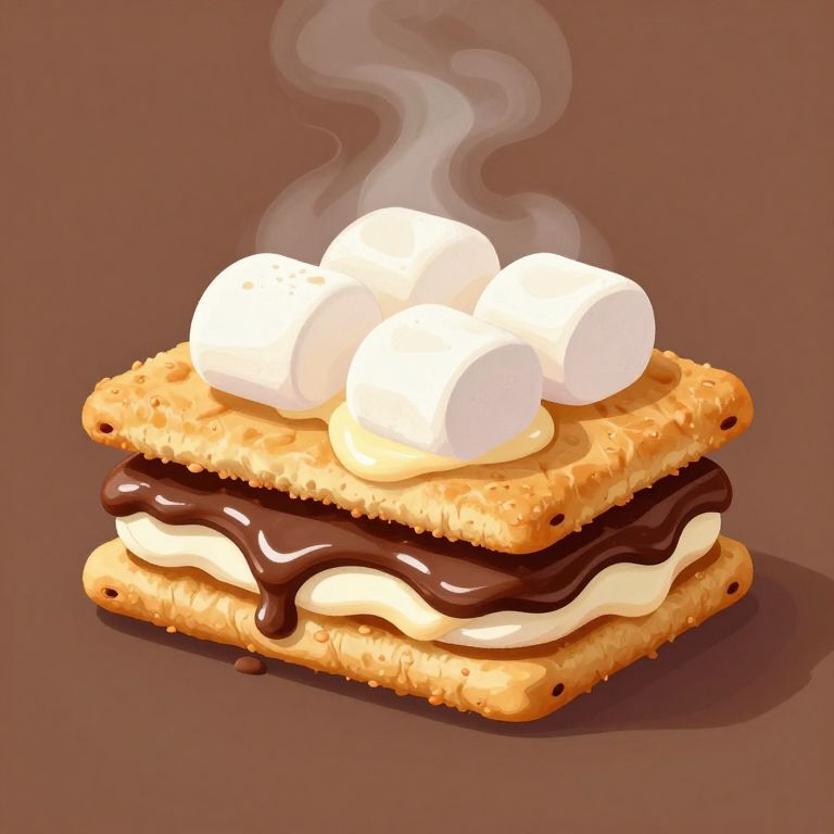A vibrant cartoon-style illustration depicts a mouthwatering campfire s'more, featuring fluffy marshmallows melting atop a gooey layer of chocolate and graham cracker, all set against a cozy brown background with a subtle steam effect, evoking warmth and nostalgia.