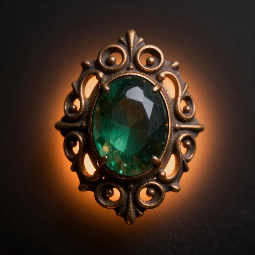Ornate, bronze jewelry piece with a large, green gemstone at the center, intricately designed with swirling patterns. Dark background with a warm, orange glow surrounding the jewelry. Single piece, centered, intense lighting highlights the gemstone.