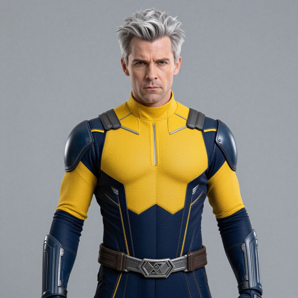A man is dressed in a highly detailed and realistic Cable cosplay costume, featuring a futuristic armored suit with yellow and dark blue elements. His serious expression and styled silver hair add to the authentic portrayal of the popular comic book character.