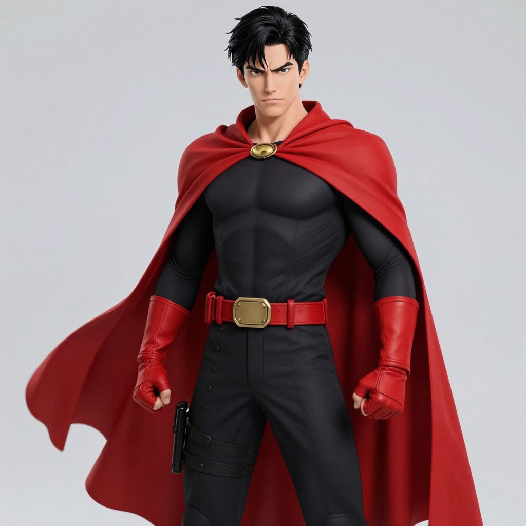 Superhero anime costume, 1boy, male focus, solo, cape, gloves, superhero, fingerless gloves, red cape, black hair, realistic, belt, clenched hands, standing