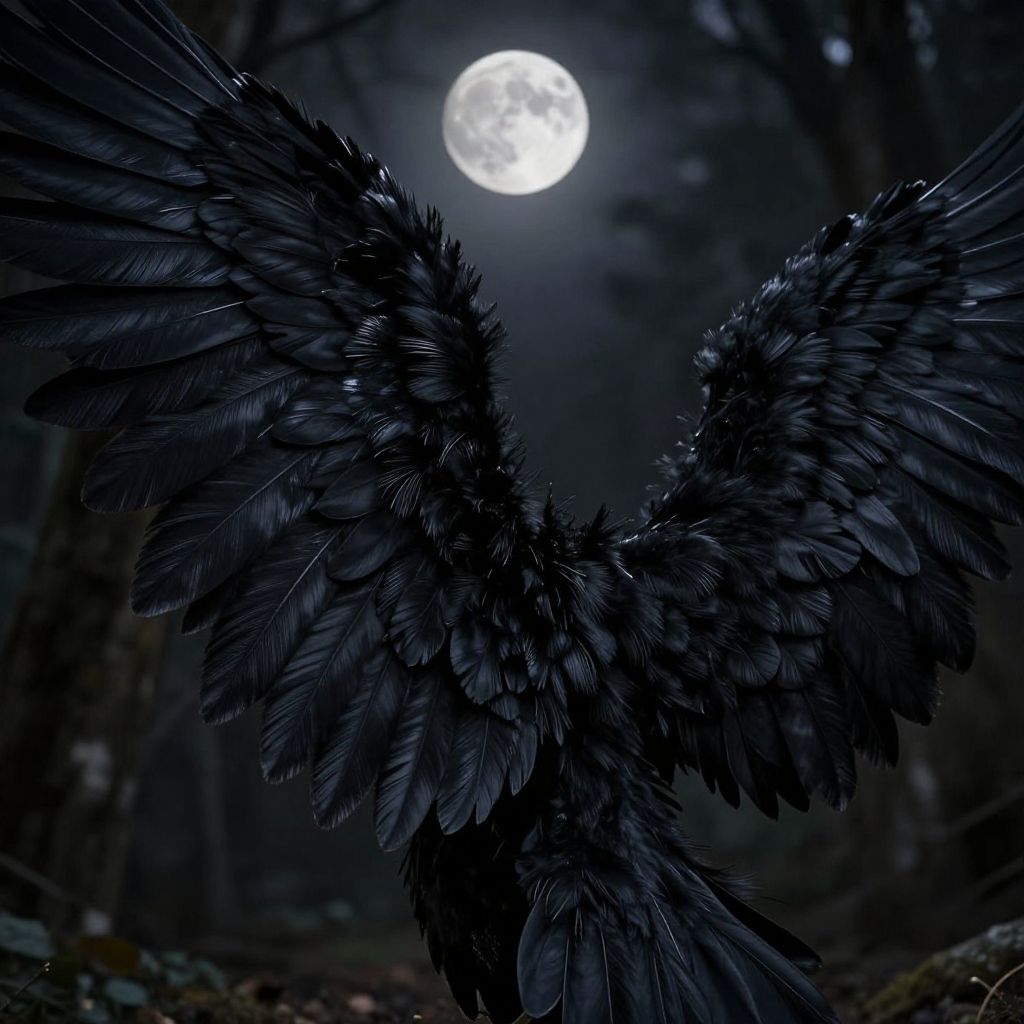 Close-up of large black angel wings unfolding in dramatic fashion, feathers layered intricately with a velvety texture, illuminated by soft silver moonlight, set against a dark forest background, blending fantasy and realism, mysterious and elegant atmosphere, cinematic composition