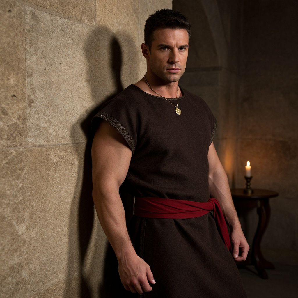 Photograph of a muscular, attractive man with short, dark hair and light skin, standing against a stone wall. He's wearing a dark brown tunic with red sash and a gold necklace. His shadow is cast on the wall to the left. In the dimly lit background, there's a lit candle on a small wooden table. The atmosphere is medieval and dramatic.