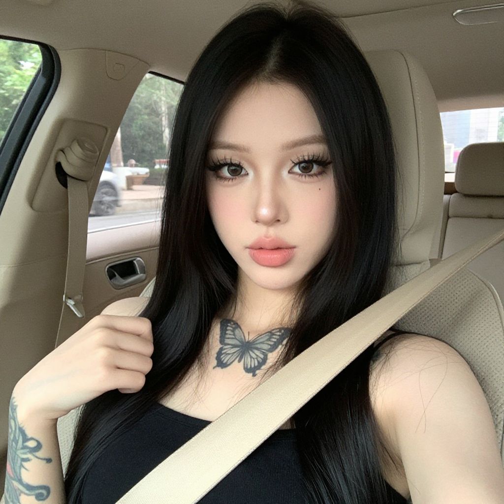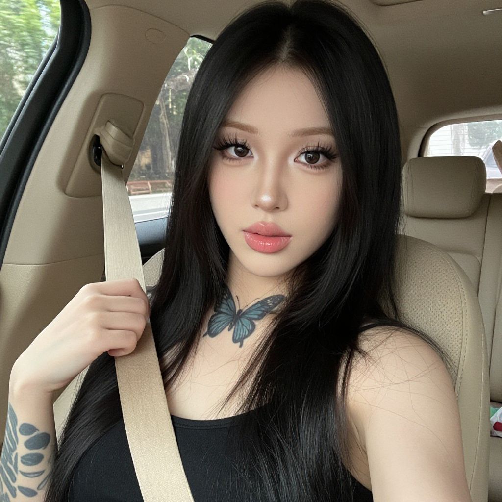 Photograph of an East Asian woman with long, straight black hair, wearing a black tank top, seated in a car. She has fair skin, full pink lips, and heavy black eyeliner accentuating her large eyes. She holds a beige seatbelt with her right hand, revealing a blue butterfly tattoo on her chest and a black tattoo on her left forearm. The car's interior is beige, with a window showing greenery outside. Her expression is neutral, and the lighting is natural. The image focuses on her upper body and face.