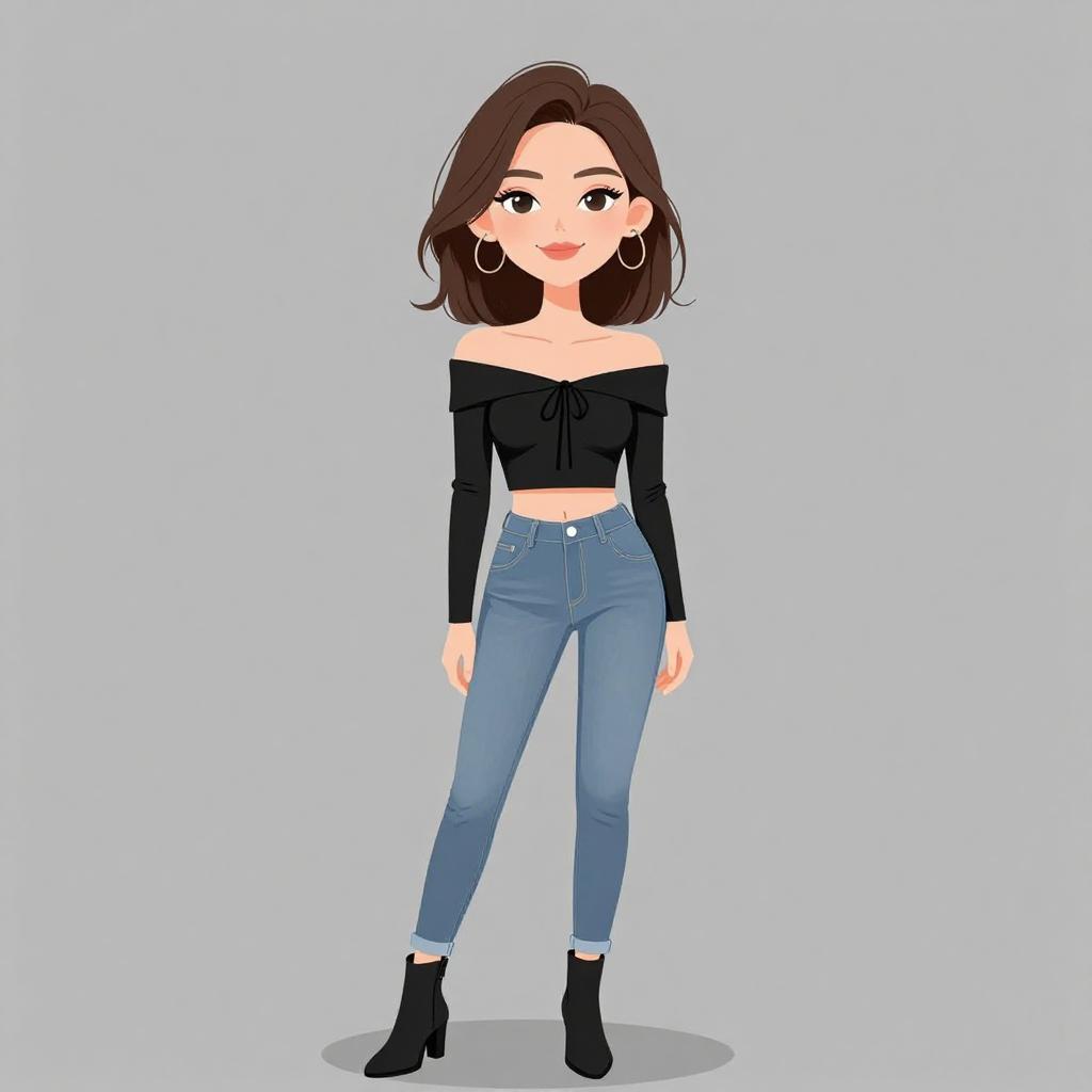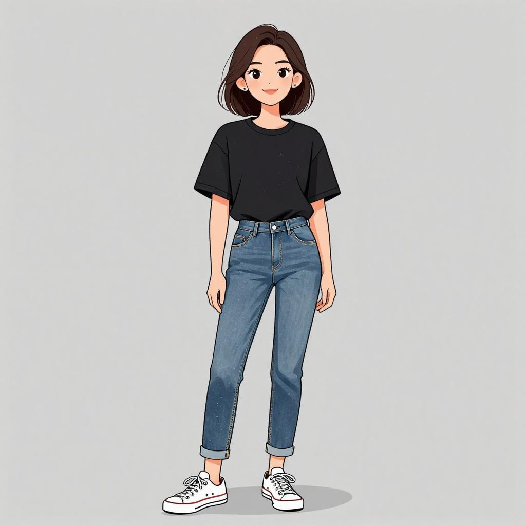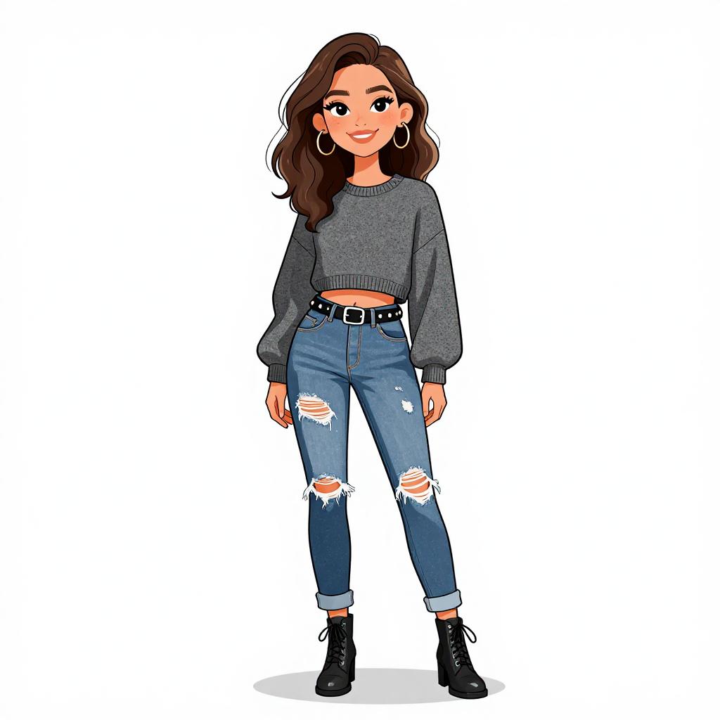 Woman with pretty face and pretty hair. smiling Man, casual grunge, faded acid-wash jeans, relaxed fit, distressed details, black button-up shirt with plaid pattern gradient at hem, long sleeves with plaid cuffs, chest pockets, black sneakers with white soles, straight long hair, neutral studio background. --sref 1467