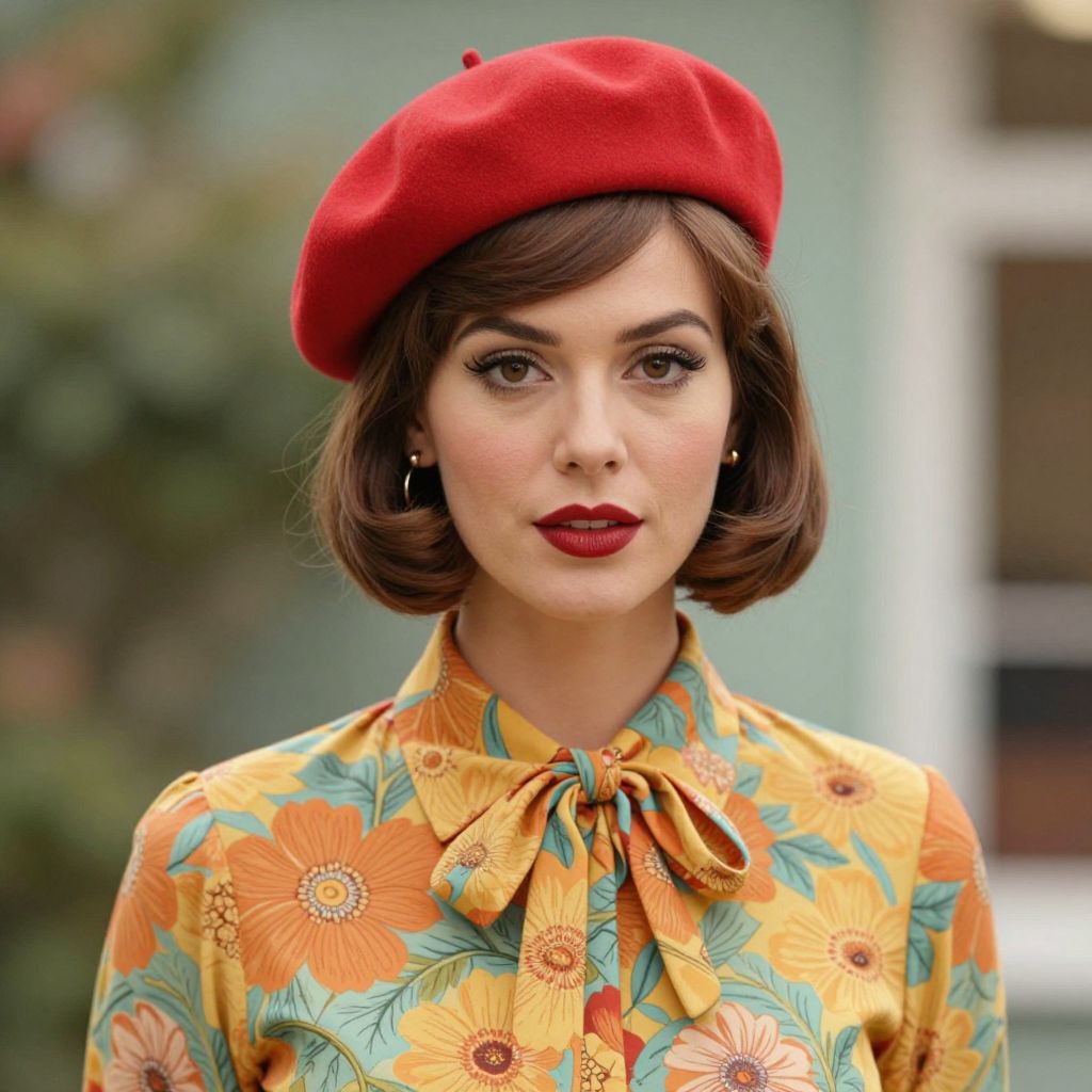 A retro-inspired digital rendering captures a woman in vibrant 60s fashion, featuring a bold red beret and a matching floral-patterned blouse, set against a blurred outdoor backdrop with a vintage aesthetic.