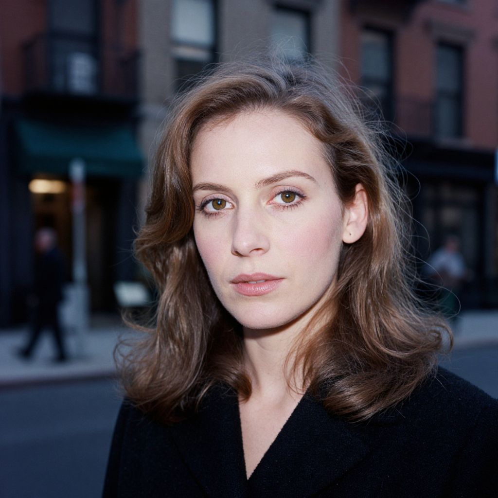 Photograph of a Caucasian woman with fair skin and shoulder-length, wavy brown hair, wearing a black coat. Her expression is neutral, with slightly parted lips and brown eyes looking directly at the camera. The background is a blurred urban street scene with brick buildings and a lit storefront, creating a contrast with the bright, high-contrast lighting on her face. The overall style is contemporary, with a focus on sharp, detailed facial features against a softly blurred city backdrop.
