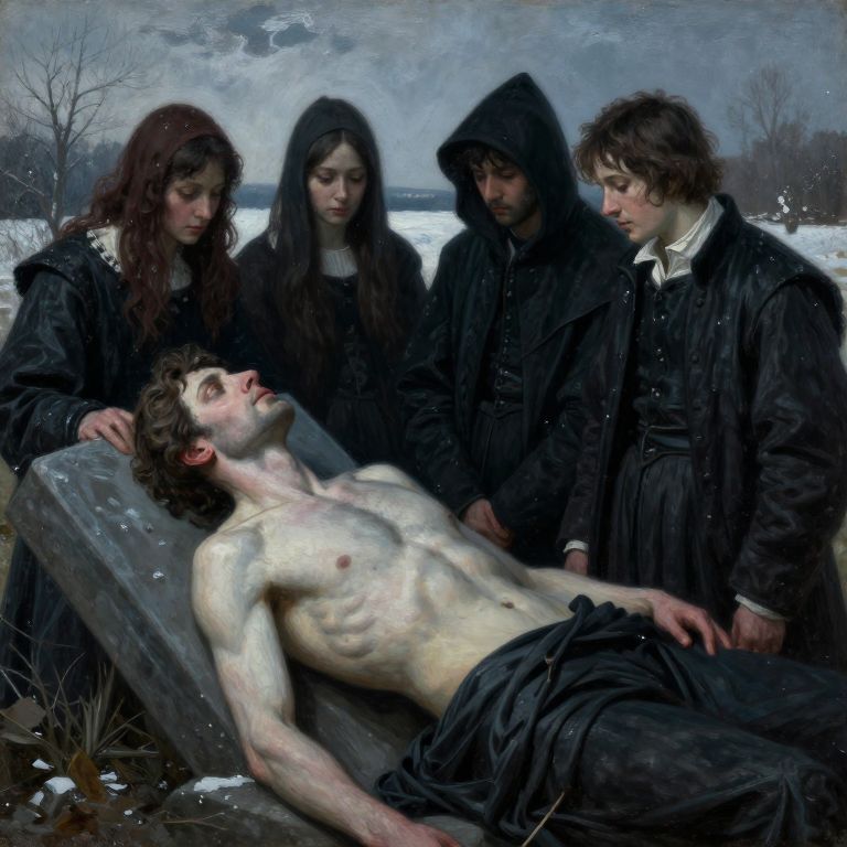 Quartet reinassance oil painting, grave coming out of a mans chest, cold colors, sad winter, nostalgic atmosphere,