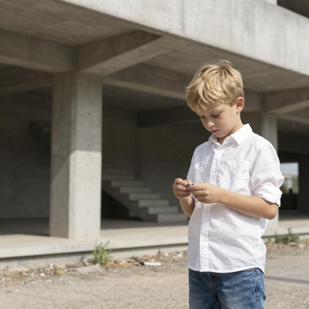 Photograph of a young boy with short blonde hair, wearing a white shirt and blue jeans, standing under a large concrete structure. He is looking down at a small object in his hands. The background features tall concrete pillars and a set of stairs. The ground is covered in dirt and debris. The scene is brightly lit with high contrast.