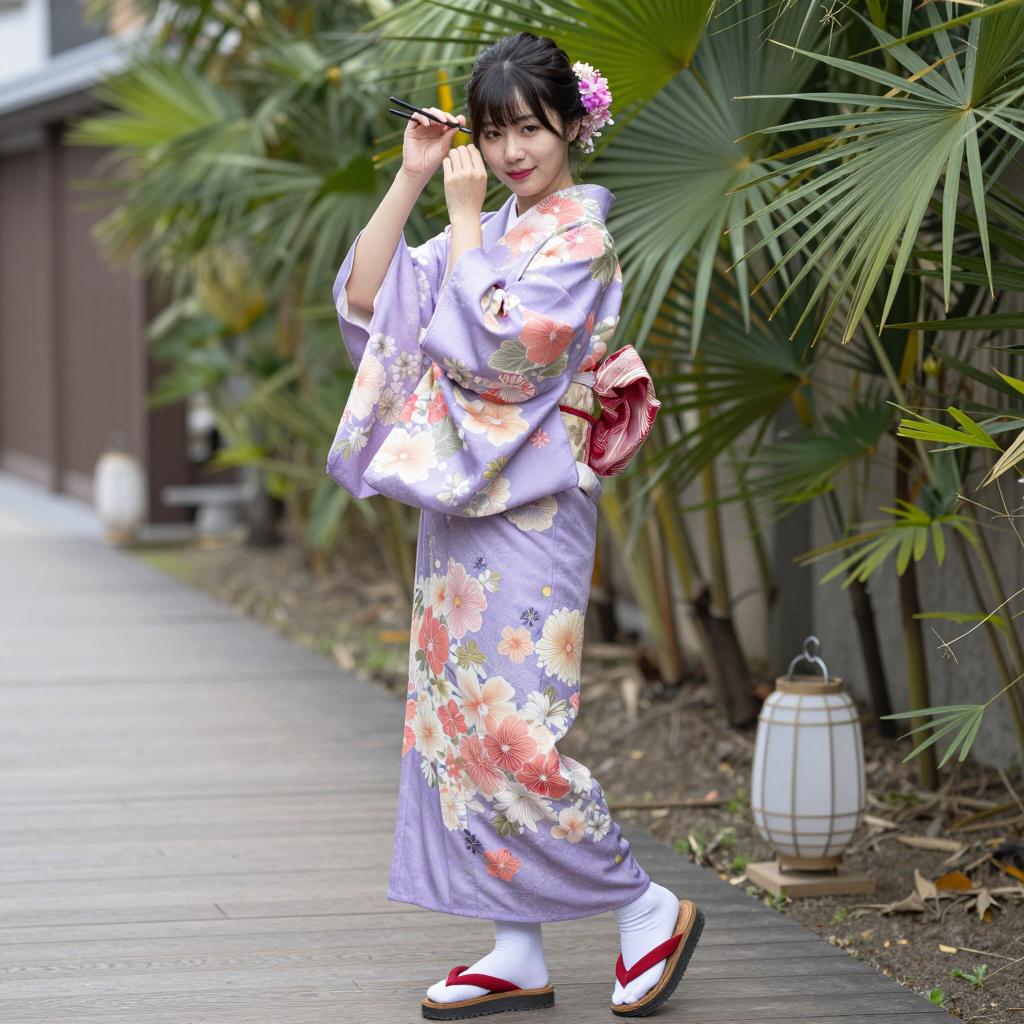 East Asian woman in elaborate black and gray kimono with floral patterns, holding red paper parasol. Short brown hair, hair accessory. Standing on stone path. Green foliage, circular stone structure in background. Black leggings with gold designs, sandals. Neutral facial expression. Full-length view, slightly turned to the side. Natural light.