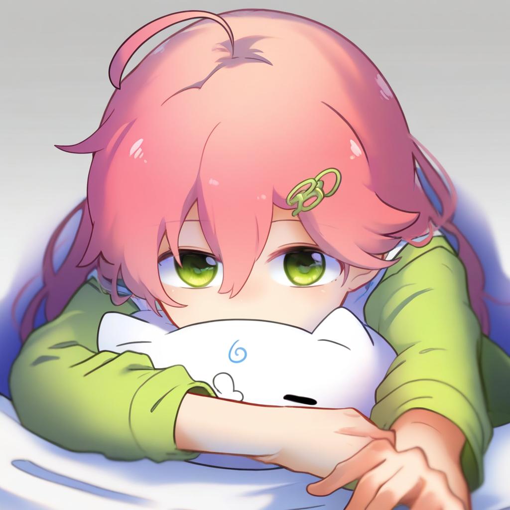 35p (sakura miko), hololive, 1girl, green eyes, hair between eyes, pink hair, long hair, ahoge, hairclip, large breasts, medium breasts, long sleeves, virtual youtuber, virtual youtuber, by artist shikushiku (amamori weekly), leet