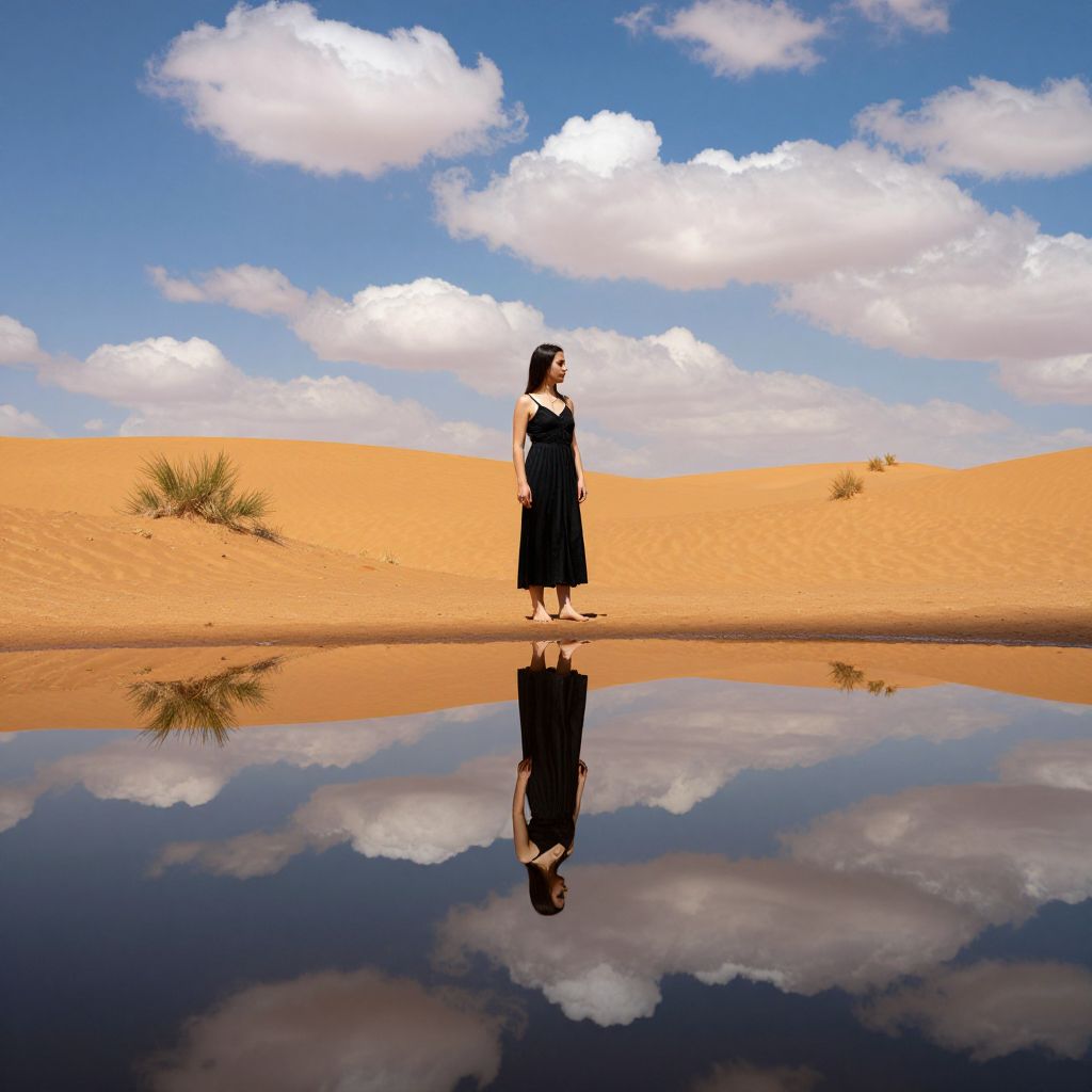 Woman standing in a vast desert landscape, her reflection mirrored perfectly in a tranquil pool of water below, surrounded by sparse vegetation and under a vibrant sky dotted with fluffy clouds.