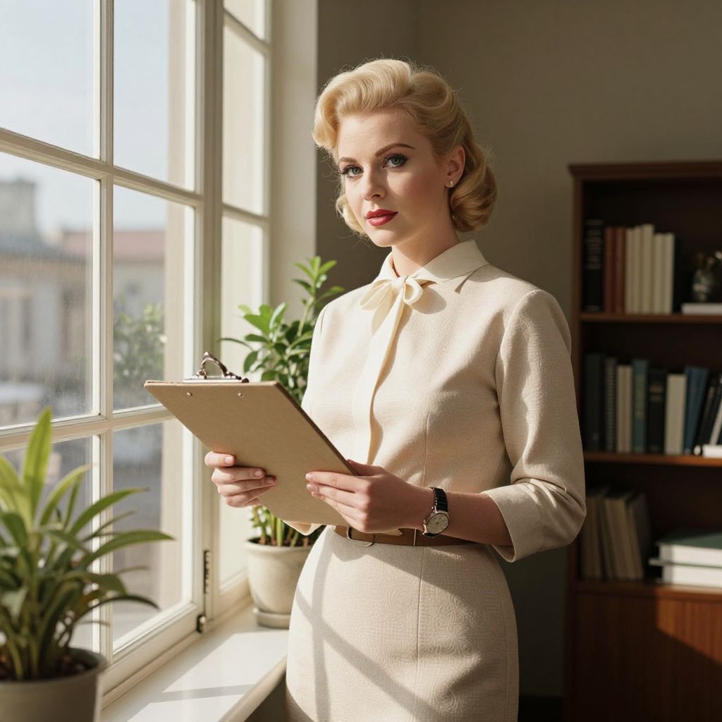 Blonde secretary standing confidently beside a large window, holding a clipboard, dressed in classic 1950s office attire, warm sunlight casting shadows, elegant hairstyle, office plants and bookshelves in the background, cinematic color grading.