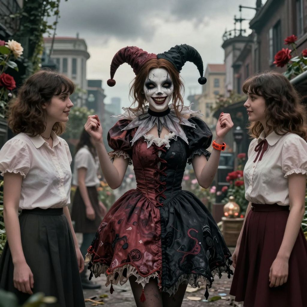 Photograph of a street scene featuring a central female figure dressed as a jester with a painted white face, black and red half-mask, and a tattered, two-toned dress. Her jester hat has black and red points. She stands confidently with fists raised, flanked by two young women with wavy brown hair, wearing white short-sleeve shirts and brown skirts. The background shows a cloudy sky, old brick buildings, and vibrant red and white flowers in planters. The image has a slightly surreal, fantasy-like quality with rich, contrasting colors and dramatic lighting.