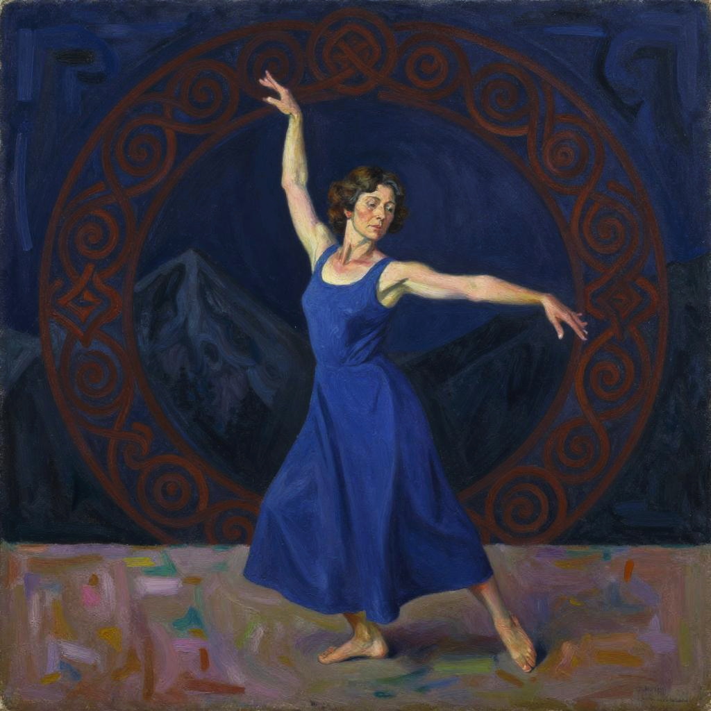 Realistic photo.a middle-aged woman dancing by the mountains, oil painting in the style of Henri Matisse, Use celtic swirls in rich deep colors to create a hypnotic background. realistic photo
