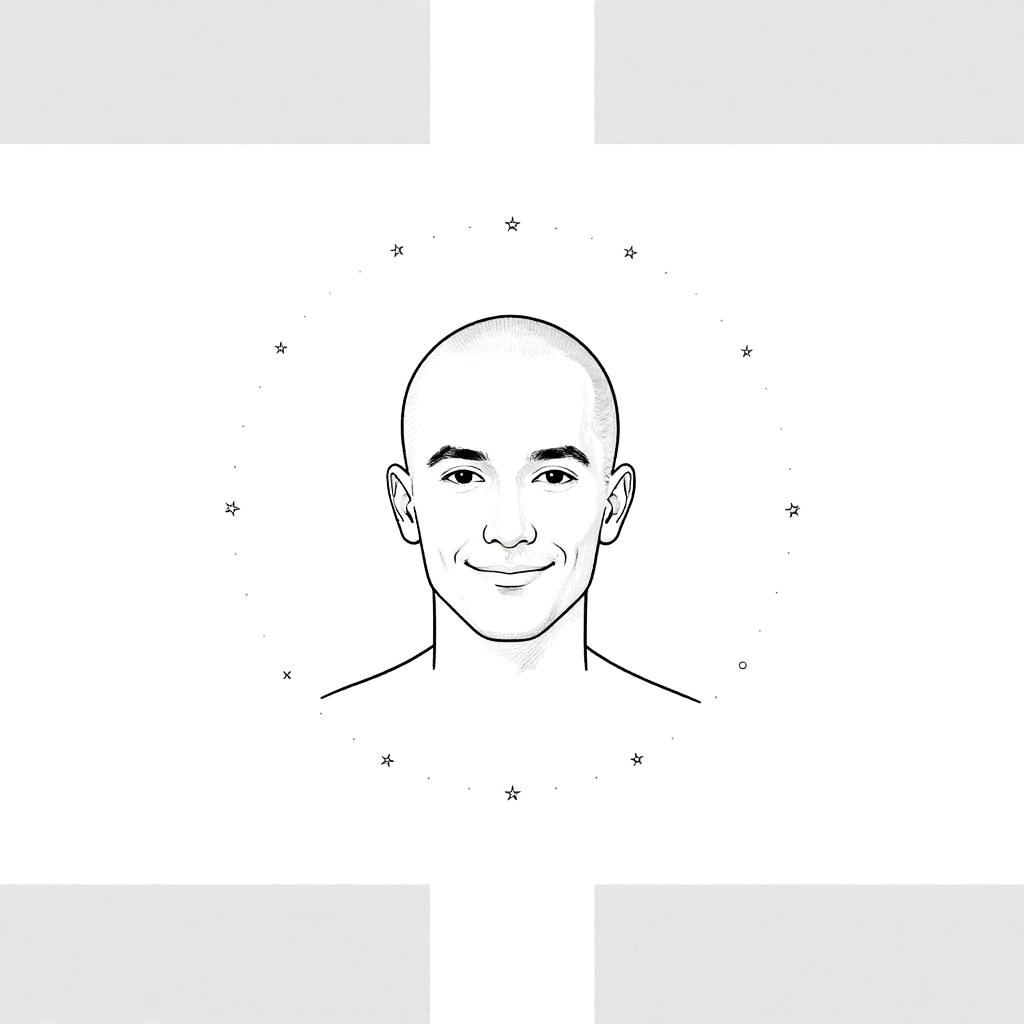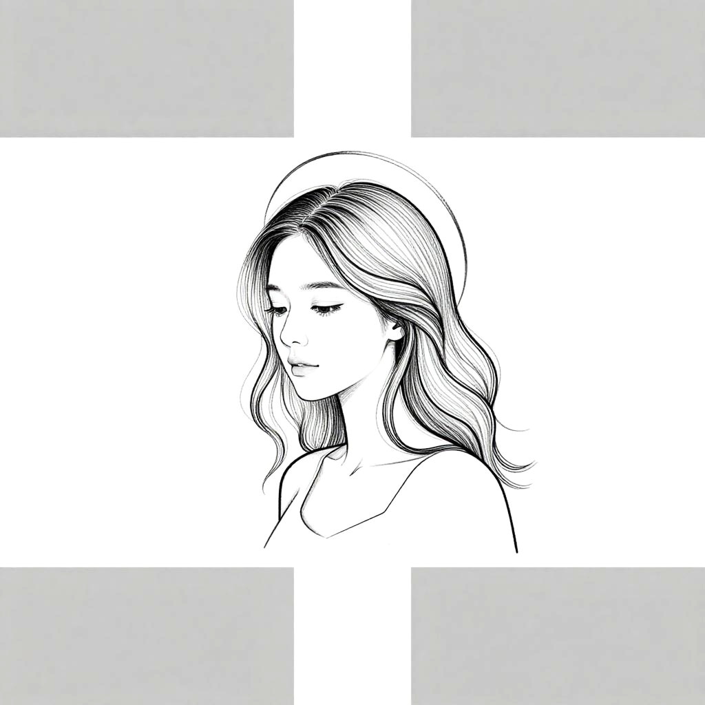 Minimalist black-and-white line portrait of girl with shoulder-length straight hair, eyes shut peacefully, adorned with thin minimal feathered wreath. A tall vertical white stripe divides the center while soft gray bands cap the top and bottom. Ultra-thin monoline, clean contours, high contrast, ample negative space, Sumi-e tradition + postmodern graphic elements, elegant, no shading, centered composition, white background, quiet contemplative atmosphere.