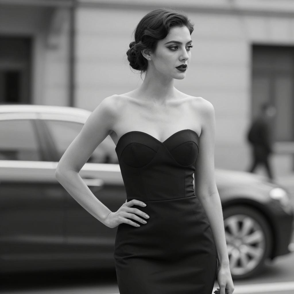 Black and white photograph of a stylish woman standing outdoors, facing slightly to the right. She has dark hair in an elegant updo, wears a form-fitting, strapless black dress with a sweetheart neckline, and dark lipstick. Her right hand rests on her hip. The background is blurred, featuring a car and indistinct buildings, creating a shallow depth of field. The lighting is soft, with a slight overcast effect. Camera angle is eye-level, capturing her from the waist up.