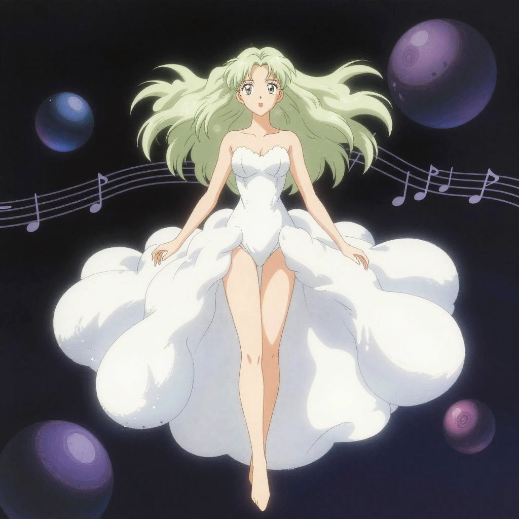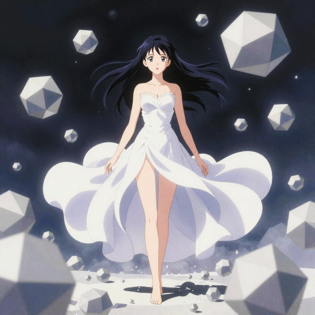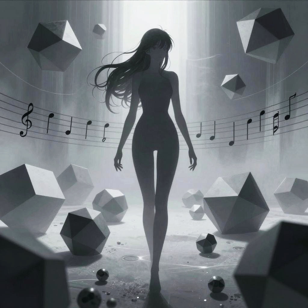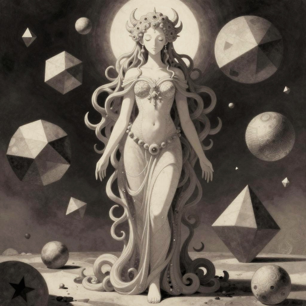 Kay Nielsen, Ayang Cempaka, bizarre interdimensional vista, mystic otherworldly maiden, stylized contemporary anime, surreal, strange, fantasy, Sci-fi, harmonious pitch integrated with geometric abstraction, melody nucleating through fractured Platonic solids, perfect voluminous form, statuesque, intricately detailed masterpiece