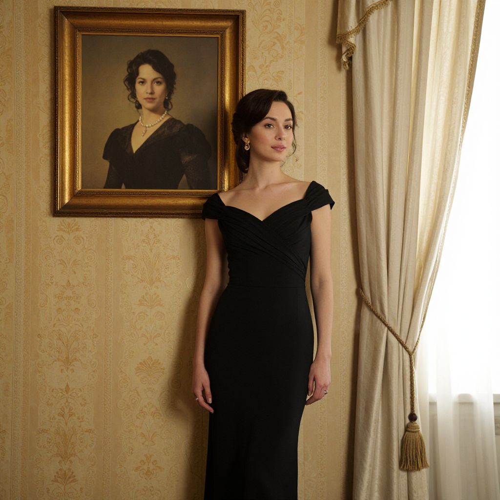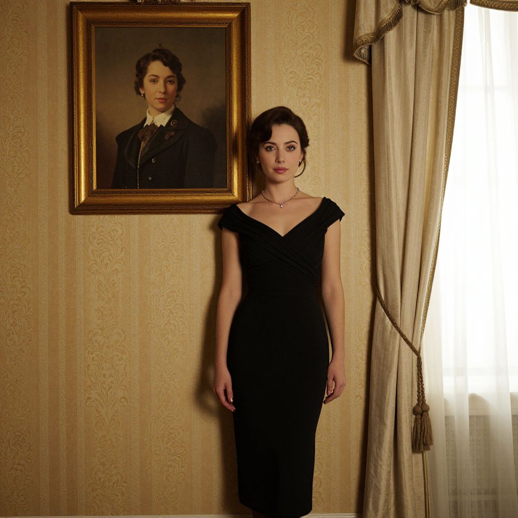 Woman in a black dress stands elegantly against a vintage wallpapered wall, framed by a gold-framed portrait and a window with cream curtains, exuding a classic and sophisticated ambiance reminiscent of period dramas.