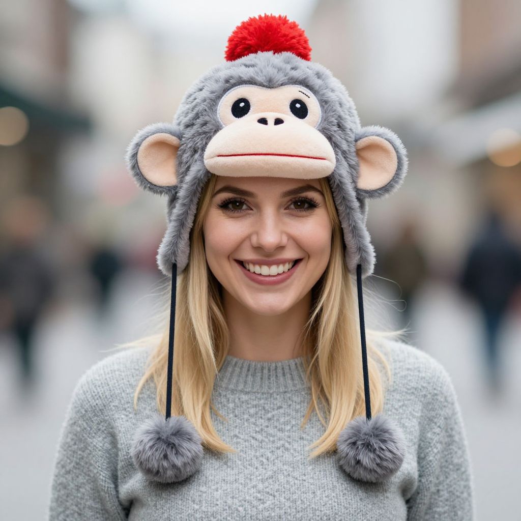 Blonde woman wearing a festive Sock Monkey hat with gray ear flaps and a red pom-pom, paired with a cozy gray sweater, smiles brightly against a blurred urban background.