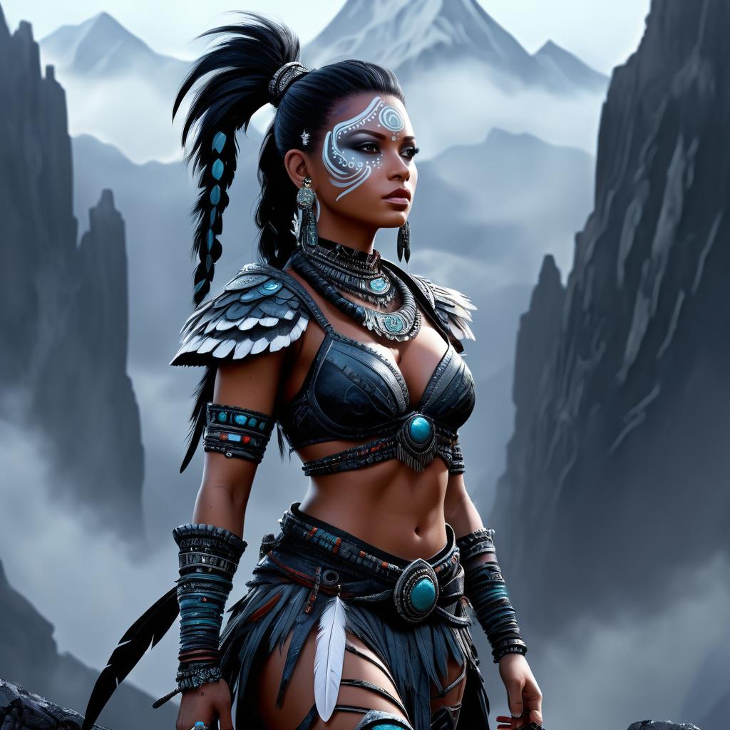 This digital artwork depicts a strong, dark-skinned woman with a high ponytail and white face paint featuring a circular design. She wears a black, feathered, tribal-style bikini top and skirt with turquoise gem accents, and an armlet and bracelets. Her muscular physique is highlighted by her attire. She stands in a dramatic, mountainous landscape with jagged, dark peaks and misty atmosphere. Her intense gaze is directed to the right, and the overall style is highly detailed and realistic with a fantasy theme. The color palette includes dark blues, blacks, and whites, creating a stark, powerful contrast.