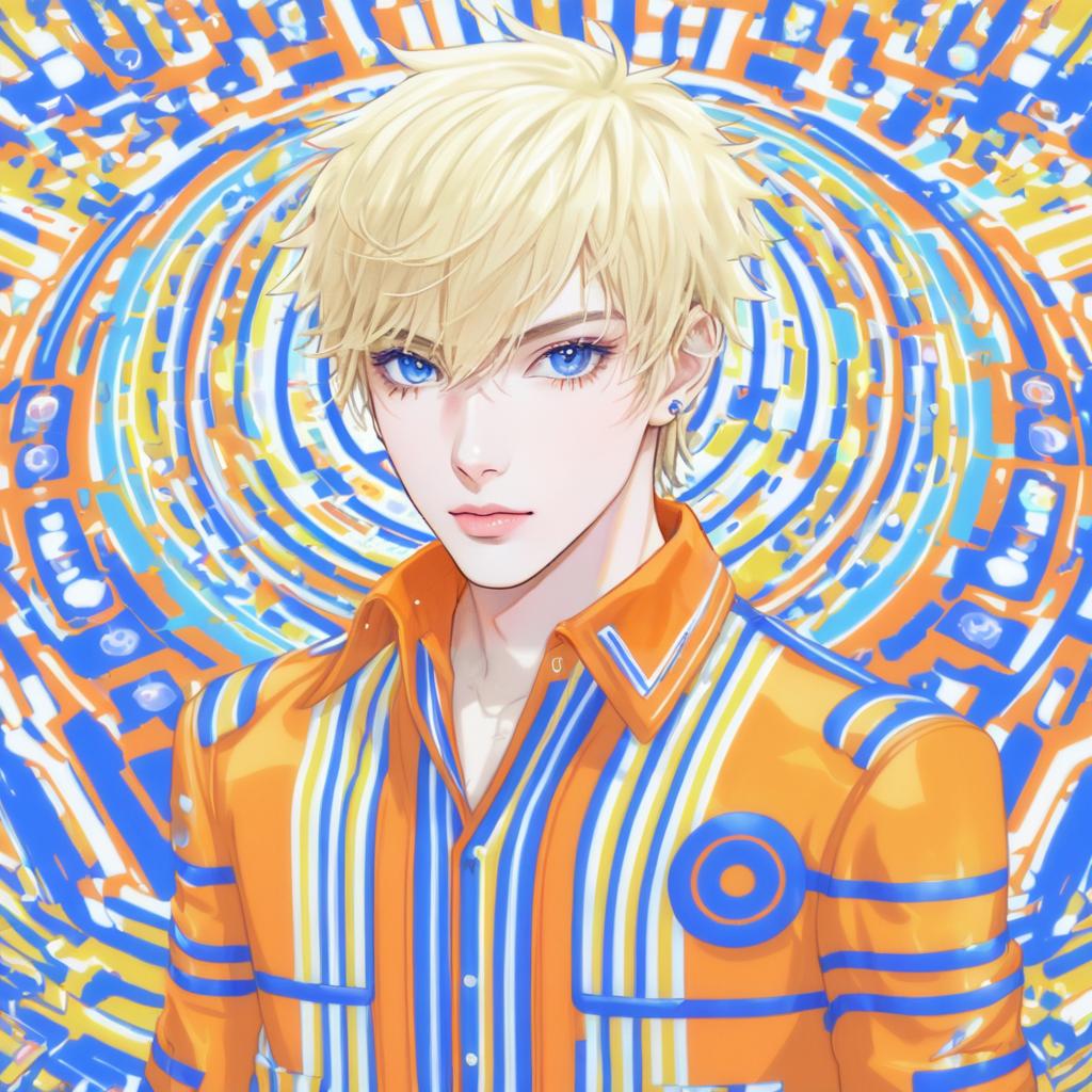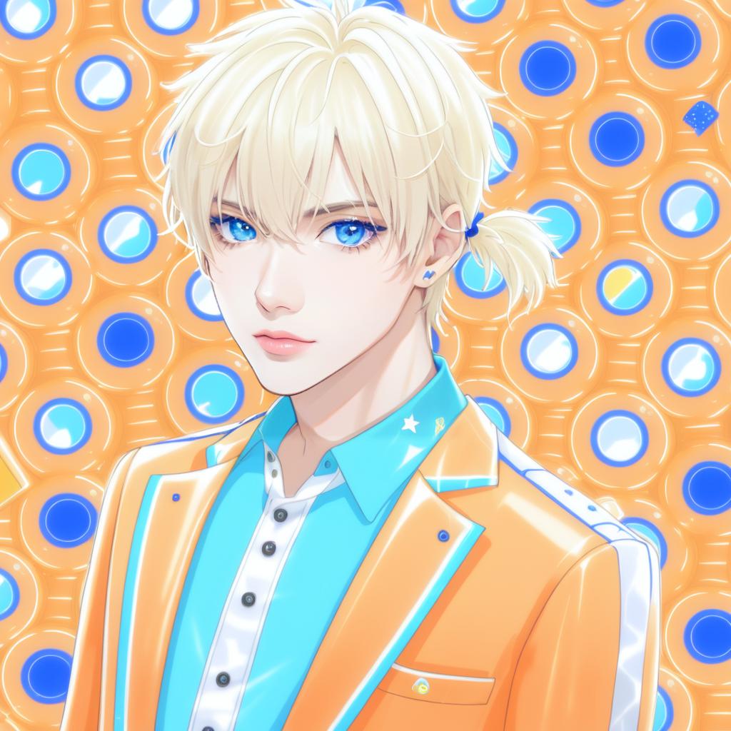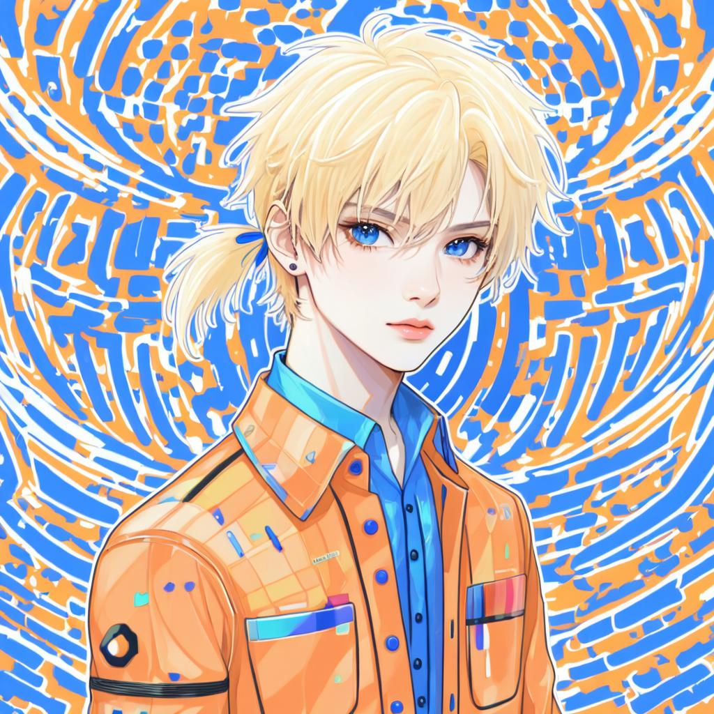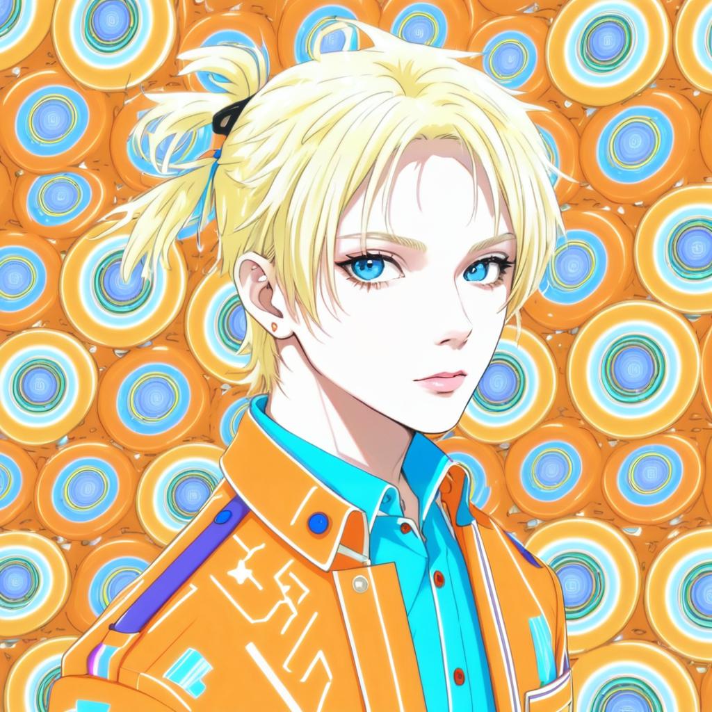 Allen avadonia, vocaloid, 1boy, blue eyes, colored eyelashes, blonde hair, short ponytail, hair ribbon, orange jacket, collared shirt, by artist mozukuzu (manukedori), anime