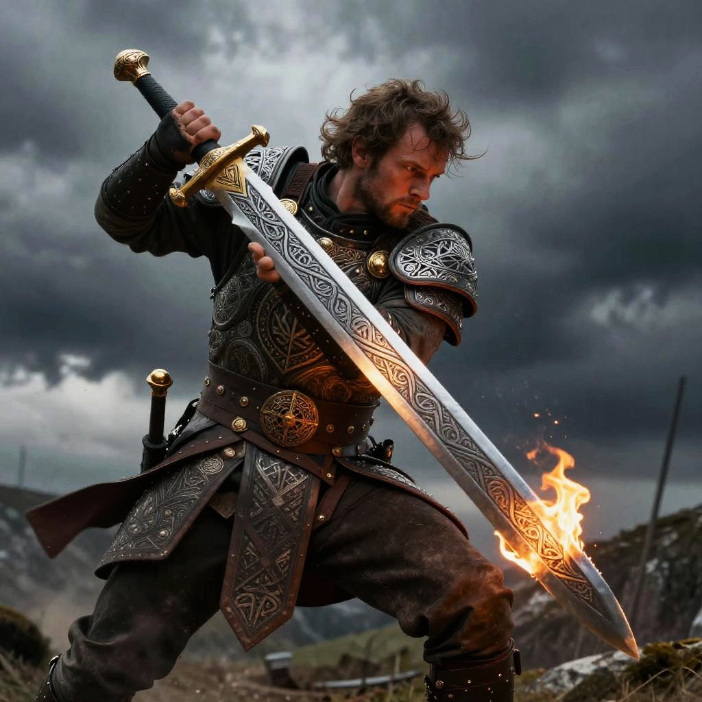 Warrior wielding a Celtic greatsword in battle, dynamic motion, elaborate blade engravings reflecting firelight, rugged armor with tribal motifs, stormy sky backdrop